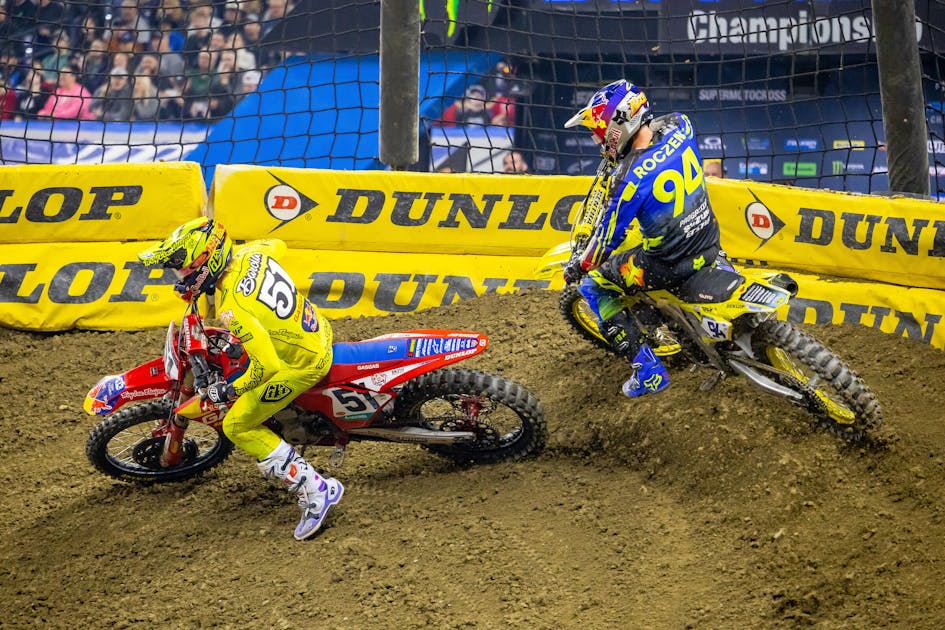 It was a great battle for the win in the 450SX class at the 2023 Indianapolis Supercross, but only one rider can take the checkered flag first. Troy Lee Designs/Red Bull/GasGas rider Justin Barcia was one of the fastest riders on the track in the main event but just couldn’t quite find his way around Ken Roczen at the end for his first victory of the season. Still though, Barcia was overjoyed with the result as a welcomed return to the podium and he was all smiles after the race.
