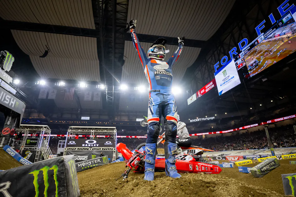 After seeing so many wins slip away due to his own late-race crashes while leading, Chase Sexton inherited one in Detroit. Aaron Plessinger had his first career 450SX win en route until he crashed just before the white flag. Sexton, who had battled hard to make his way to second, grabbed the lead and hung on for his second win of the season.
