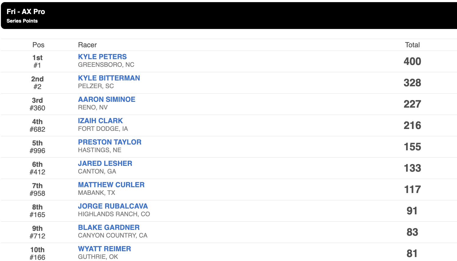 | 3 | Cooper Webb | Newport, NC | 304 |