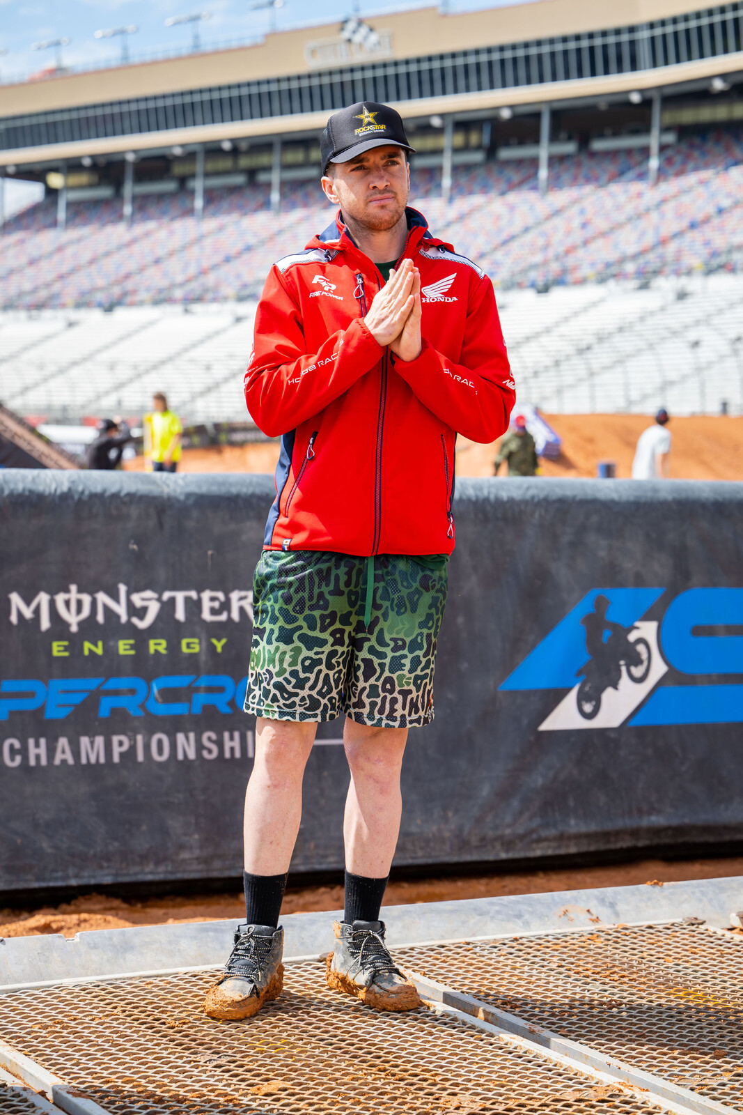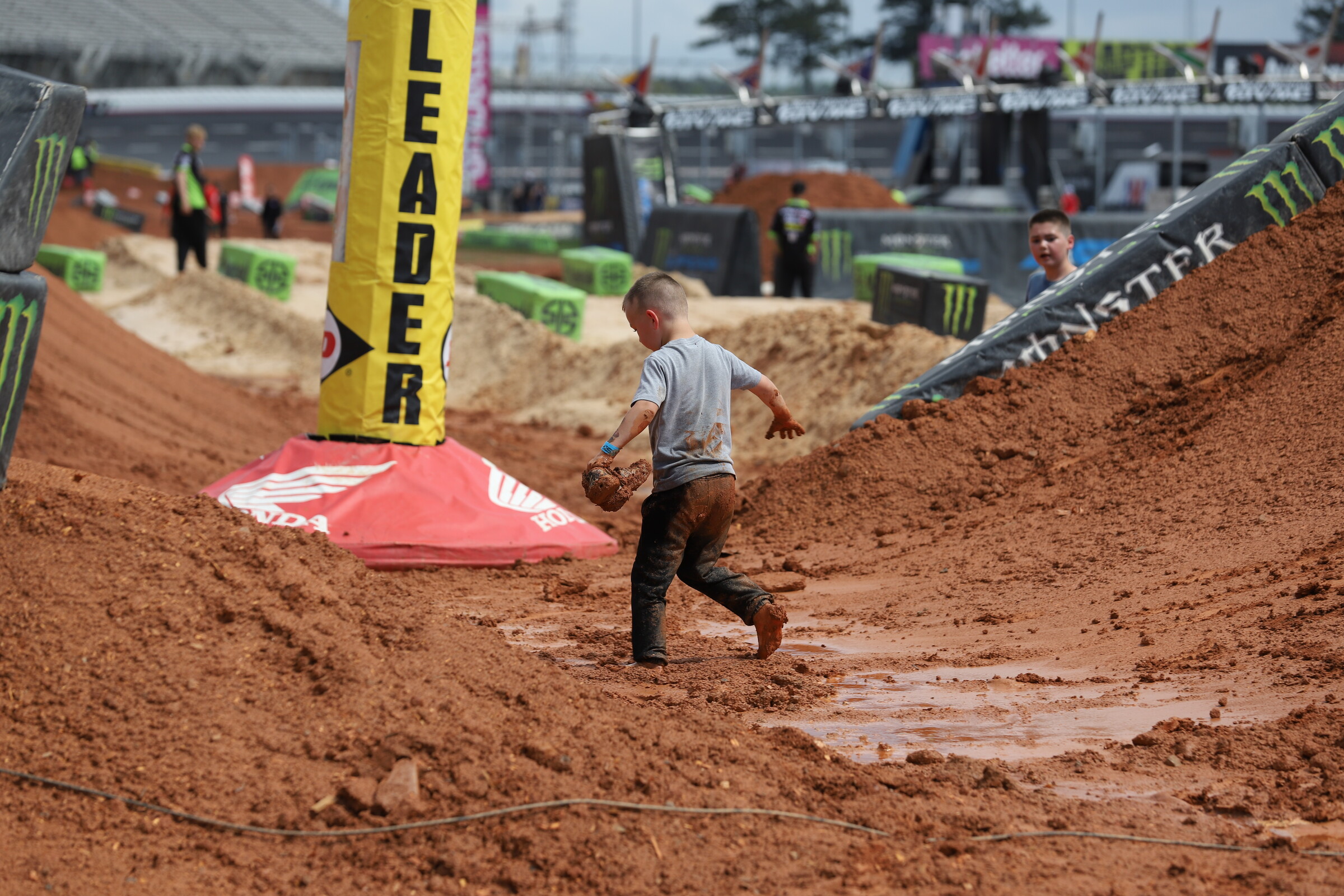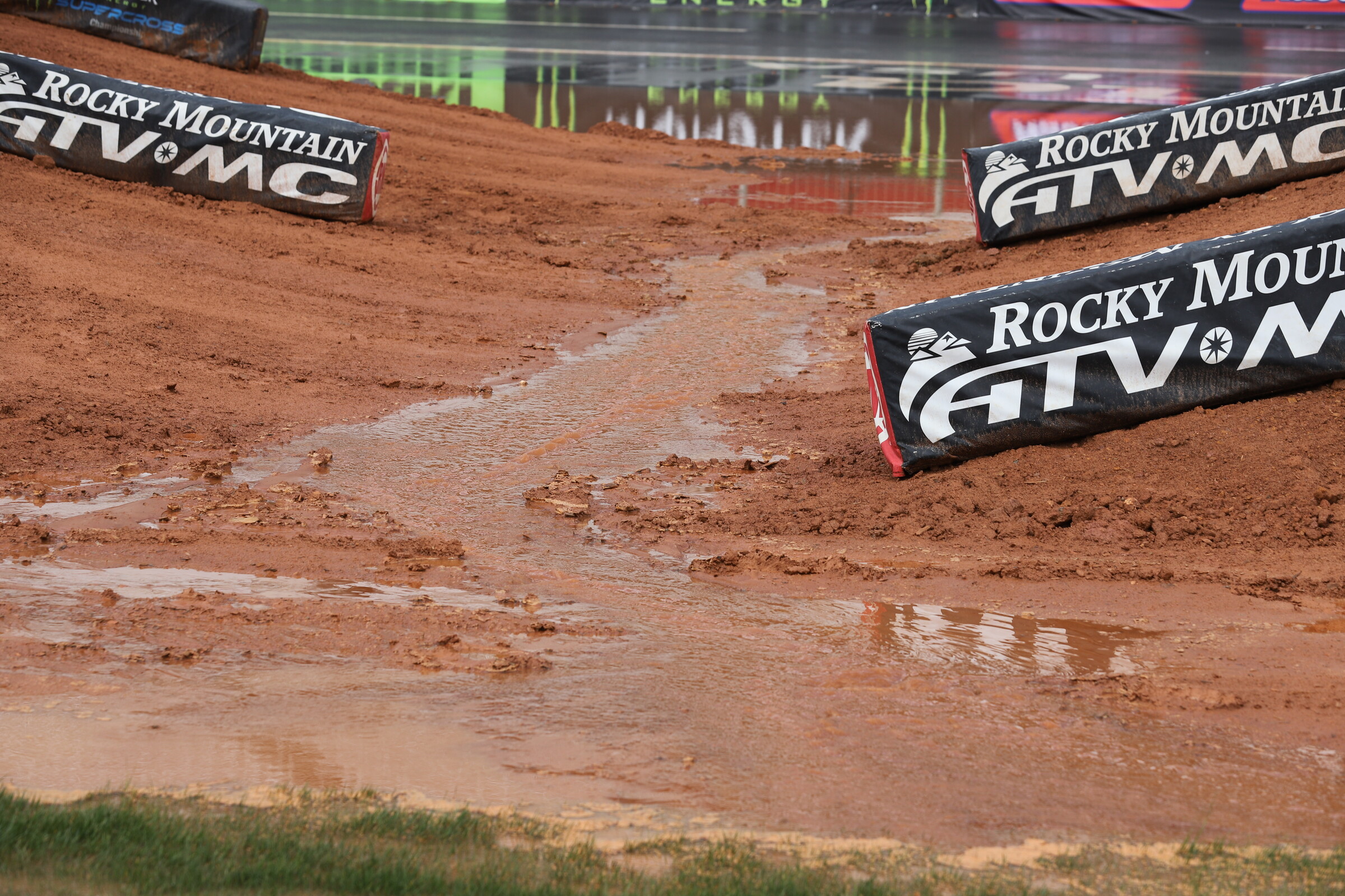 In all seriousness, the track did take somewhat of a beating today, as puddles sat in the low spots of the now muddy circuit. But we do expect dry conditions with a high of about 80 degrees tomorrow. The riders we talked to are excited to get another shot at a speedway race and for the 250SX East Region riders a nice break since the Detroit Supercross (March 18) meant some time at home and some motocross testing. We have seen some wild racing here in the past and might expect to see some tomorrow as well. Make sure to tune in at 3 p.m. Eastern/12 p.m. Pacific.