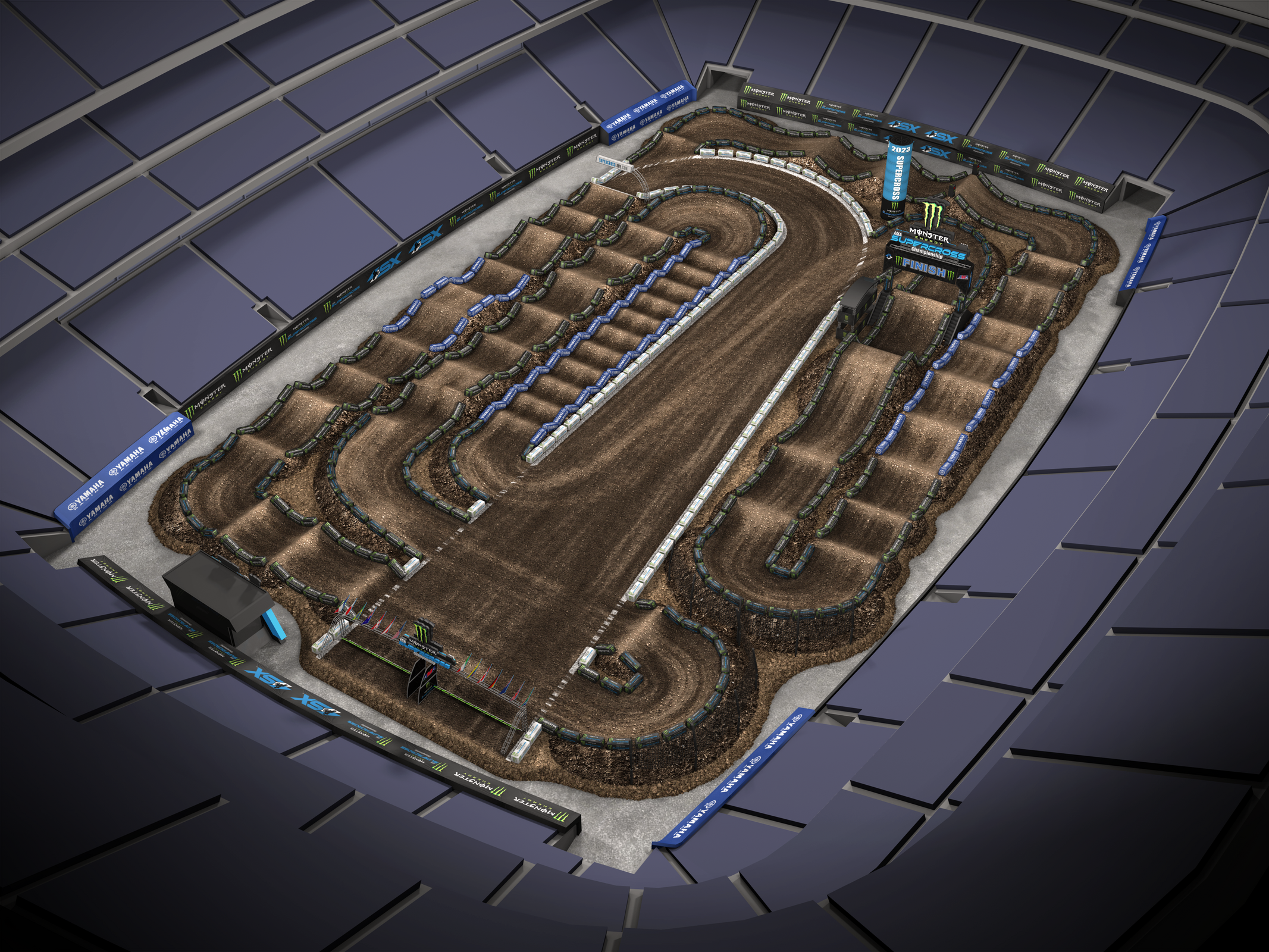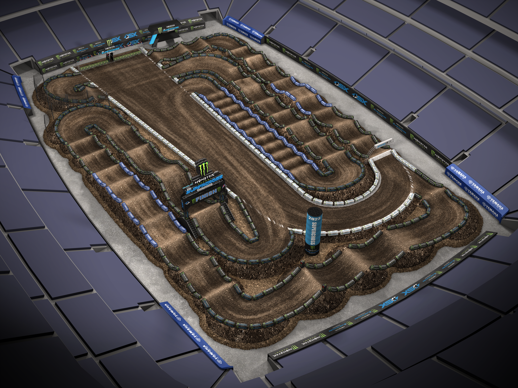 Riders exit a flat 180 right after the whoops and scream back down the start straight but instead of turning left, they turn right and into the final corner before the finish line jump. A small double after the finish line fires riders into a netted bowl berm and back down the home sideline of MetLife Stadium.