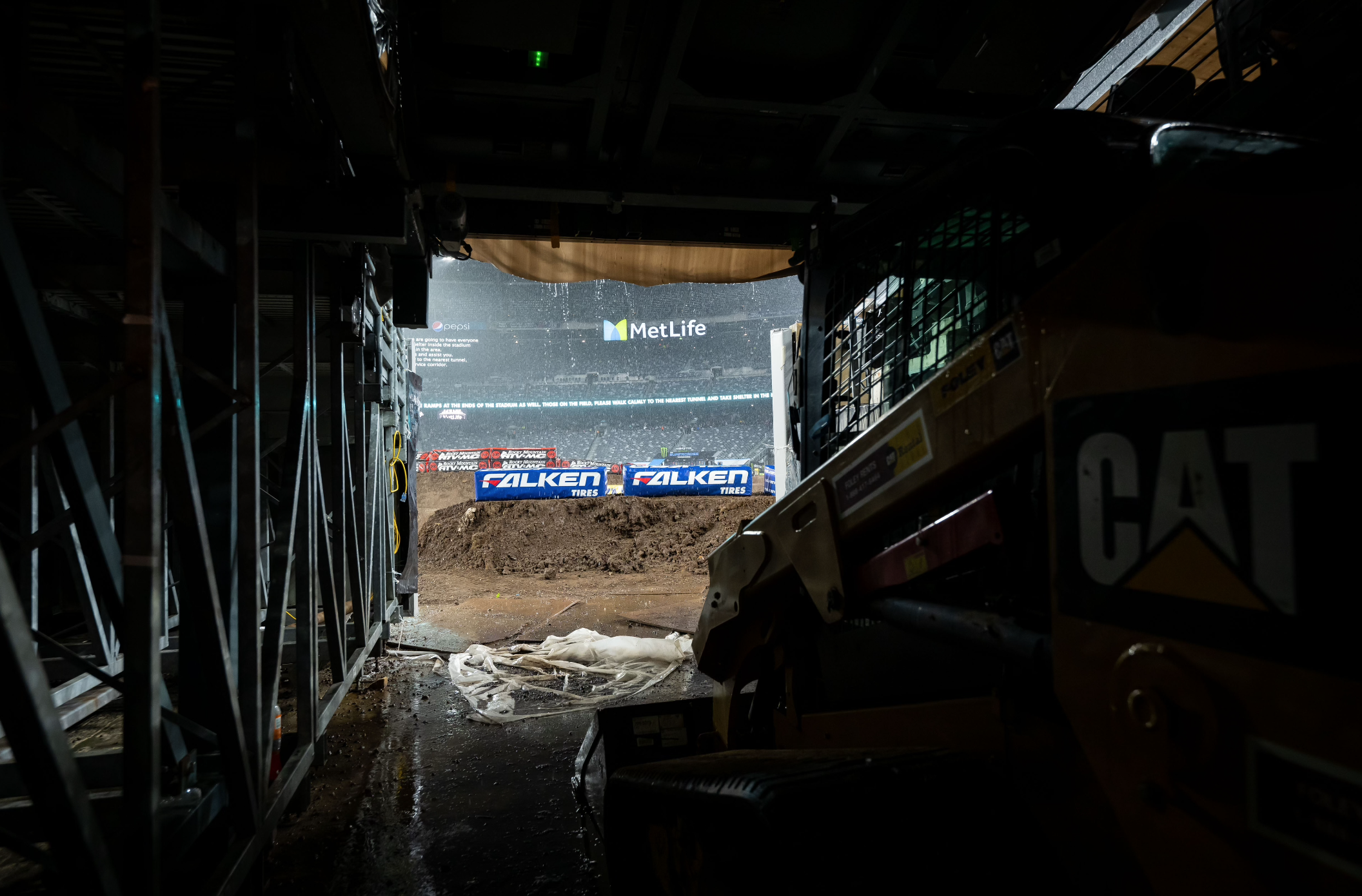 Until moments before the sight lap, the stadium announced a weather delay. With expected thunderstorms, the stadium asked fans in the lower bowl of the NFL stadium to find shelter under roofing in the concourse. We went from the 250SX main event gates about to drop to fans being shuffling back under shelter as bikes were taken off the starting line. Everything quickly went up in the air. Would we still be racing the main events? When would we race the main events?