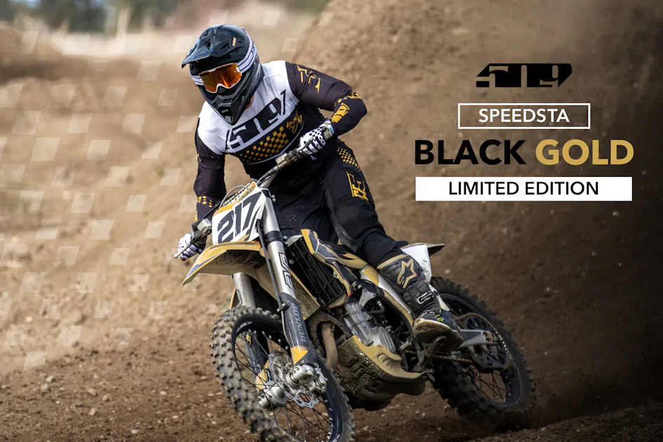 The LE 509 Day speedsta black gold dirt collection features helmets, goggles, jerseys, pants, gloves, t-shirt, and sunglasses. The exclusive checkered black gold color represents 509’s “pin-it-to-win-it” 20-year history expanding across riding categories and developing products for you to enjoy riding.