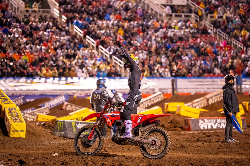 In the final 250cc race of his professional career, Jett Lawrence went out with a bang. The Australian native had already clinched the 2023 250SX West Region title one week ago in Denver, Colorado, and was playing with house money at the final round in Utah. Still, without championship situations on the line, the newly crowned #1W went out and won the Dave Coombs Sr. East/West Showdown main event. It was the 13th career 250SX main event win for Jett (and his sixth win of the ’23 season), who now shifts his focus to the 450 Class for the AMA Pro Motocross Championship. He joined his brother Hunter—the 2023 250SX East Region Champion—(or “HJ” as Jett refers to him) for a post-race press conference shortly after the final checkered flag waved. Here is what Jettson had to say about his day and his season as a whole, and moving to the premier class.