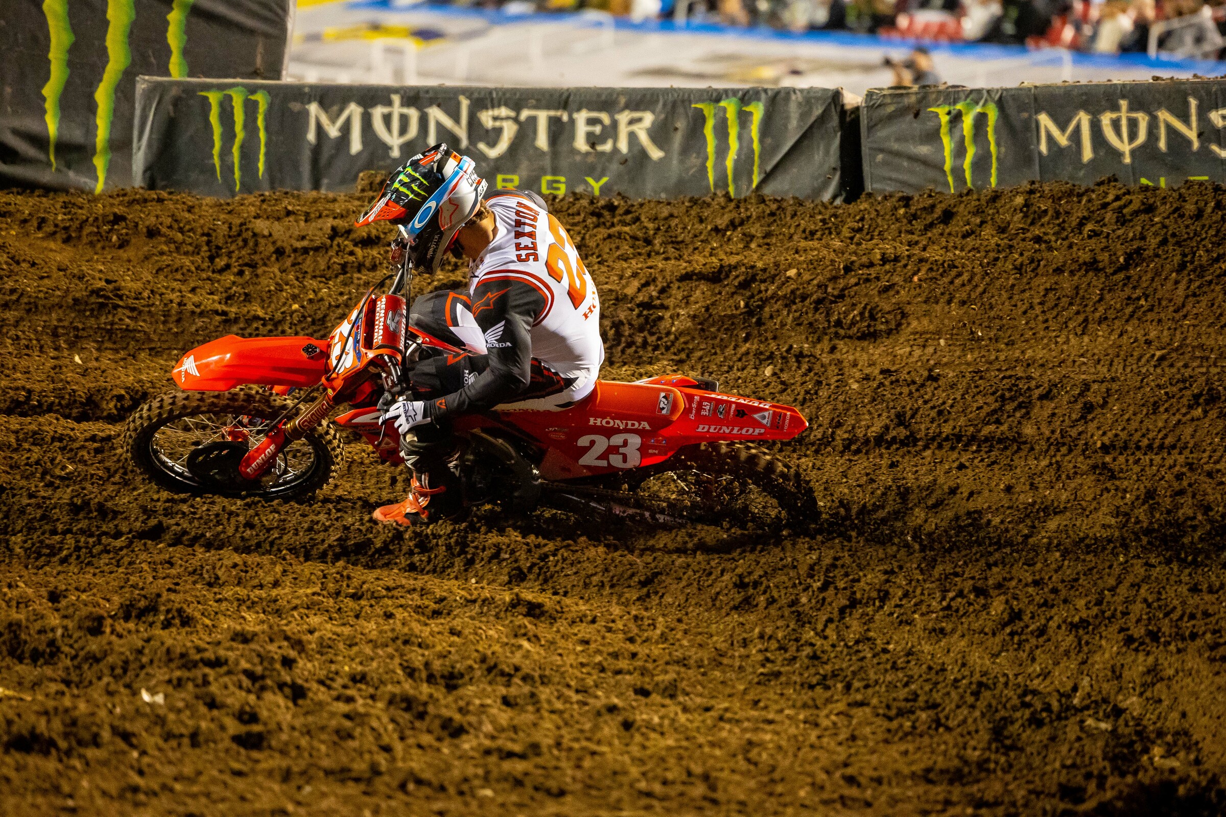 At the 2023 Monster Energy AMA Supercross Championship finale, Chase Sexton claimed the main event win—his sixth of the season—and the 450SX title. Sexton claimed the first Honda premier class AMA Supercross title since Ricky Carmichael won with the brand in 2003. For Sexton, who turned pro with the GEICO Honda team in 2017, this title fulfilled a promise he made a few years ago by saying he would get Honda a premier-class championship. The Illinois native claimed the title in his special Chicago Bulls-themed Alpinestars gear (after Michael Jordan). In the post-race press conference, Sexton even gave a shout-out to his championship contenders Eli Tomac and Cooper Webb, saying the two two-time 450SX champions helped form Sexton into a race-winning rider he is today. Check out what Sexton had to say about his race day.