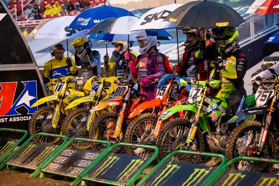Salt Lake City SX didn’t have a ton to talk about, really. There was rain and enough of it that it made the track slick and treacherous for the guys who didn’t stick to the main line. While I’m at it, I know the Utah Sports Commission people pay Feld Motor Sports a lot of money to have the final round of the series in Utah, and I guess that’s awesome for the people there, but can Feld take a little bit of a discount and have it be the second or third last round of the year? Like, we’ve run into weather quite a few times. It’s not a big stadium so the track and dirt usually aren’t that good and yeah, we all really liked Vegas as a finale, right? I get it, the Vegas stadium is not very nice either, but can we go somewhere where the track can be a good one, where there’s a roof or a very low chance of weather, and then we can all go out afterward?