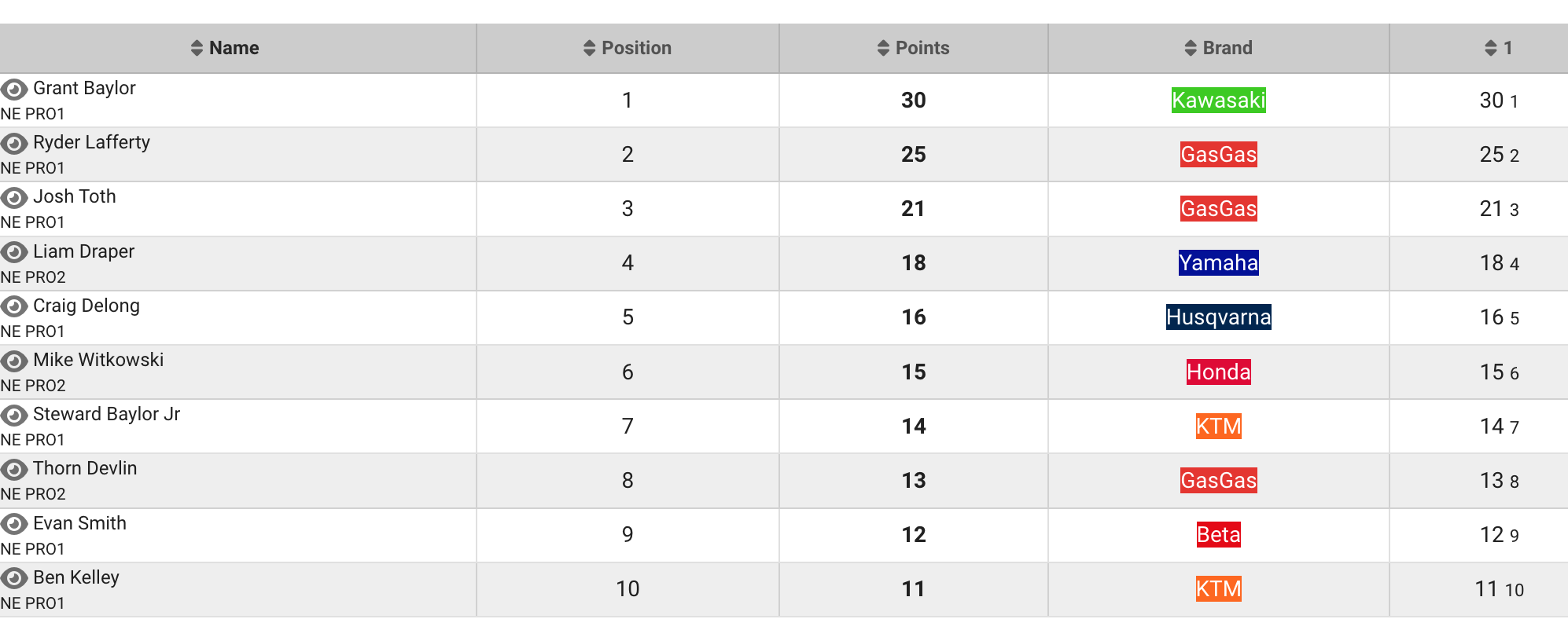 | Grant Baylor (Kawasaki) | Magna1 Motorsports AMA National Enduro Series | Pro1 |