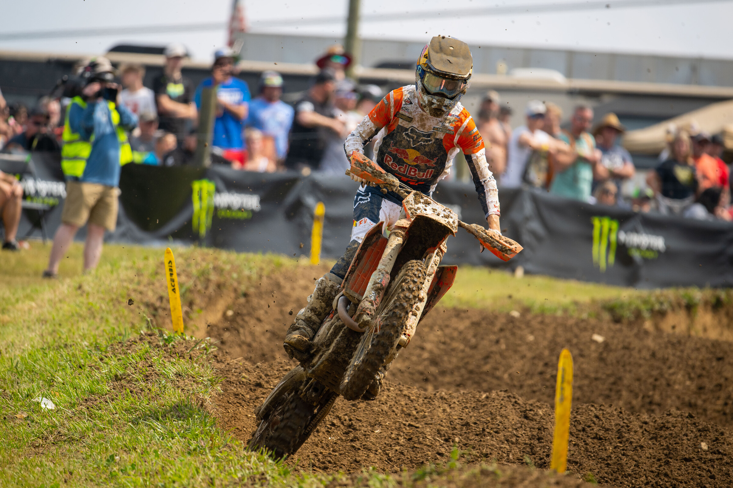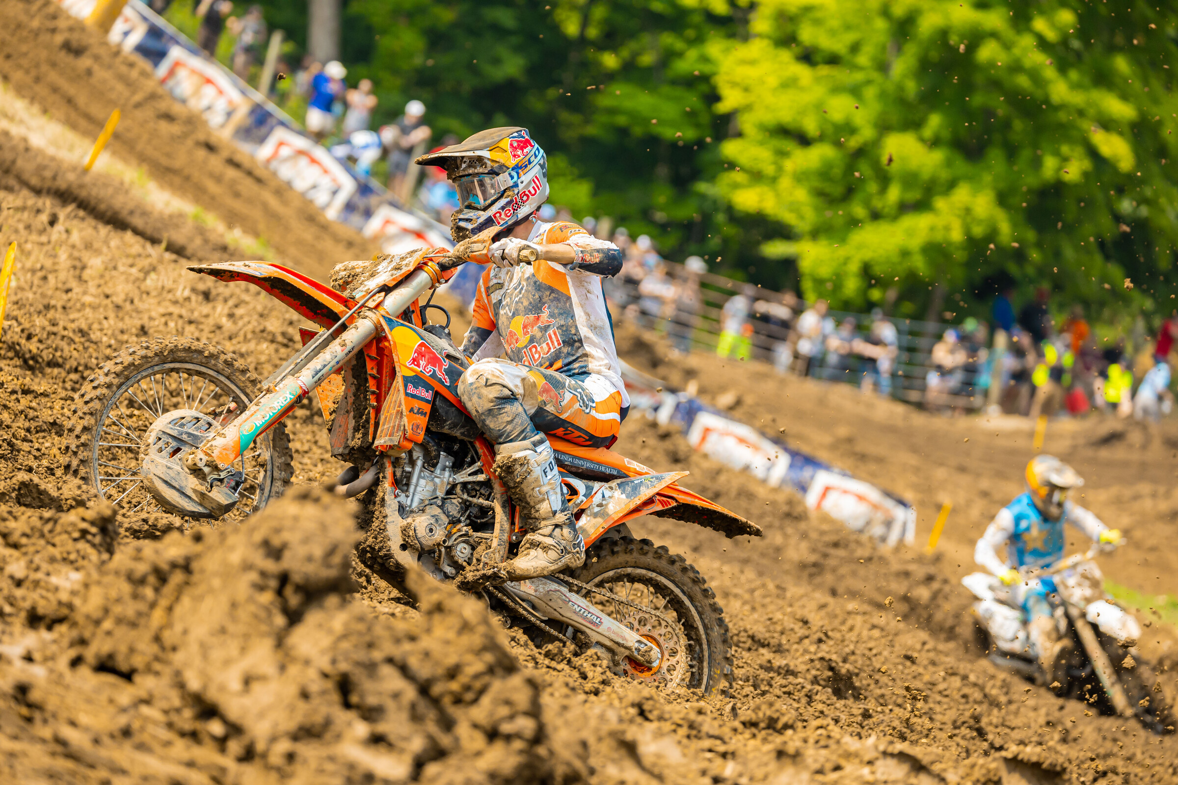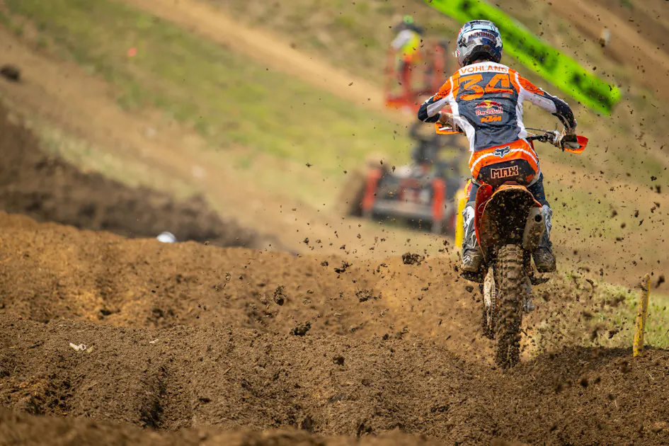 Max Vohland: I had a pretty good day; I mean it was pretty mediocre to be honest. First practice I was really comfortable, so it was good, qualified like eighth or seventh or something like that. The second practice the track was way rougher, I felt a little bit uncomfortable compared to the first practice, but I was like, “Ahh I rode so good the first practice” so I left the bike and then the first moto the track tacked up a lot. I had my steering dampener quite tight because of the mud and when it tacked up it made it really hard to stay in the ruts and to get the thing to turn. So, first moto I got a pretty good start, didn’t feel very comfortable but was able to get a sixth, not riding very well, for my standards at least. And then second moto we changed a lot on the bike, and I felt way more comfortable. I felt really good on the sight lap and kind of raced the sight lap a little bit to feel the bike out. I got a pretty good start, about the same start. I ended up not running paddle the second moto which kind of hurt off the start because everyone around me had a paddle. But I was managing it and I think I would have been fine but Haiden [Deegan] ended up falling right in front of me and I kind of got stuck on his bike, was off the track, went through the banners. Then I was already set back and I was trying to charge through the field the first lap and had a huge crash going down the super steep hill, I kind of jumped far and landed in a rut and hooked left and hit that plateau and launched that thing all the way down to the bottom down in the river basically, down in the creek at the bottom.