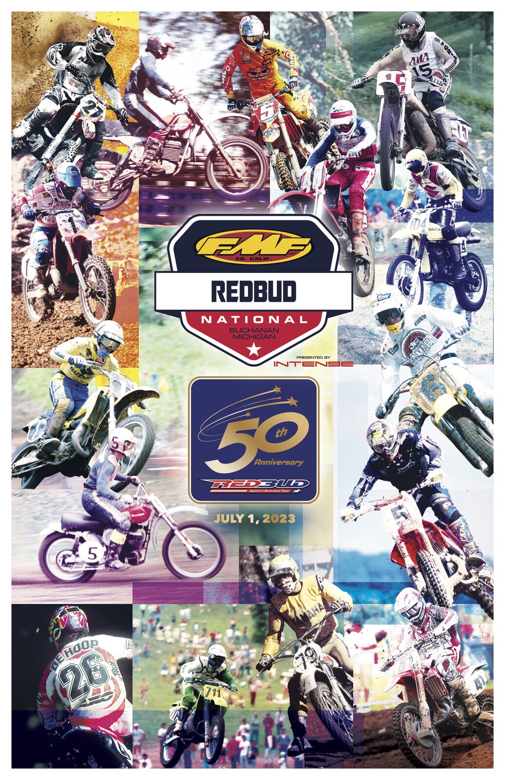 Here's the poster our girl Heather Moebus made for the RedBud fans featuring all of the alumni riders who are coming back to celebrate 50 years on the AMA Pro Motocross schedule. Most are probably easy to recognize, but if you're wondering, the man on the Penton on the upper left is local legend Rick Walsworth, and #15 in the upper right is longtime RedBud announcer (and very fast rider) Larry Whitmer, #711 on the bottom is Kentucky's Tommy Watts, and #79 is Michigan's own Mike Hartwig, who won the 500 class at that first RedBud National back in 1974. And check this out: According to Amy Ritchie, not only did Rick Walsworth qualify for the '74 250 National and finish 12th overall, his father Buck, now 87 years old, also qualified for that race! That might be a first in AMA Pro Motocross history—a father and son qualifying for the same national—but we can't find the results further back than the top 20 for this race, and Buck Walsworth, who owned Buck's Cycles in Valparaiso, Indiana, was not in the top 20. We will keep digging.