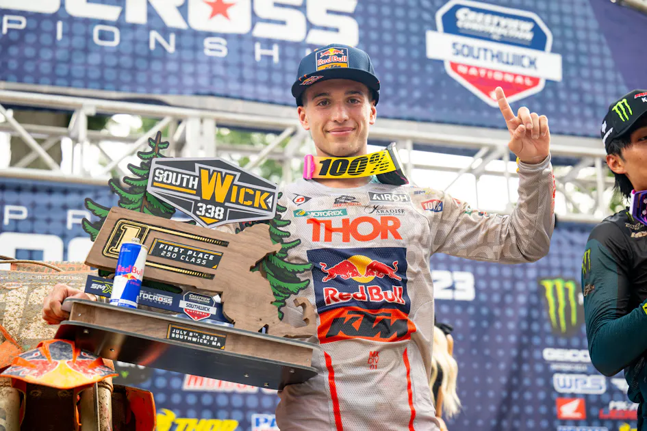 At the Southwick National, two-time MX2 FIM Motocross World Champion Tom Vialle had the breakout ride we were all anticipating when he first stepped foot in the U.S. last fall. In the Massachusetts sand, Vialle claimed his maiden AMA Motocross moto win in the first moto. The French rider positioned himself into second place and then capitalized on a tip over from Justin Cooper to take over the race win as he cruised home the last six motos. Then in the second moto, the #128 got another great start. Eventually, Jo Shimoda made a pass into the lead, but Vialle’s 1-2 would have the overall. But Cooper passed Vialle to take over second and was going at Shimoda for the race lead. Simultaneously, RJ Hampshire was charging after Vialle for third place, and if either Cooper took the race lead or Hampshire bumped Vialle back to fourth, Cooper would get the overall win over Vialle. Cooper made a last-minute mistake went down, then lost tow to Shimoda and Vialle was able to hold off a goggle-less Hampshire, meaning his 1-3 finishes would give him the KTM rider his maiden overall win as well. After the race, Vialle spoke to the media in the post-race press conference.