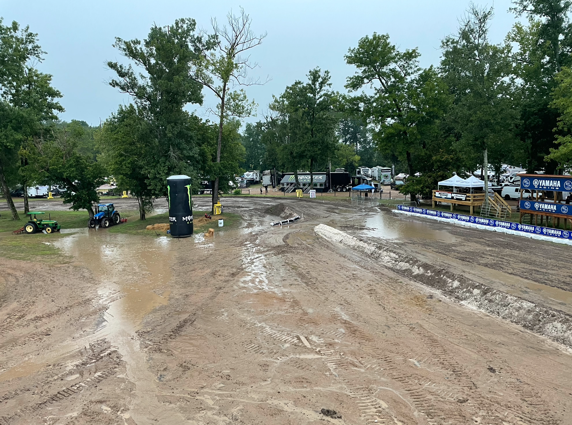 Jason Weigandt took to the RacerTV live stream for the 12 p.m. EDT (11 a.m. CDT) update from the Ranch to provide an update that it is still raining hard, although there has not been much lightning. In about an hour, the crew will provide another update. The goal is to get to racing ASAP, but with so much rain the track will be a mess. MX Spots is hopeful to get bikes back on track today without ruining the rest of the week. Once it does stop raining, there will need to be some track work done.