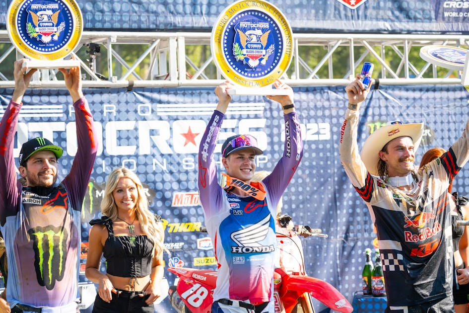 The perfect season continues for Honda HRC's Jett Lawrence, as a week after clinching the 450 championship in his first shot, he scored yet another 1-1 at the Yamaha Budds Creek National on Saturday. This one had some challenges, as Jett got a bad start for the first time and had to work his way forward in the first moto. In the second race, teammate Chase Sexton was there to challenge him again, but Sexton tipped over. It appeared Jett could cruise it on in for a victory, until Sexton came roaring back late to provide a last-lap challenge. Jett hung on for his 20th moto win in 20 starts.