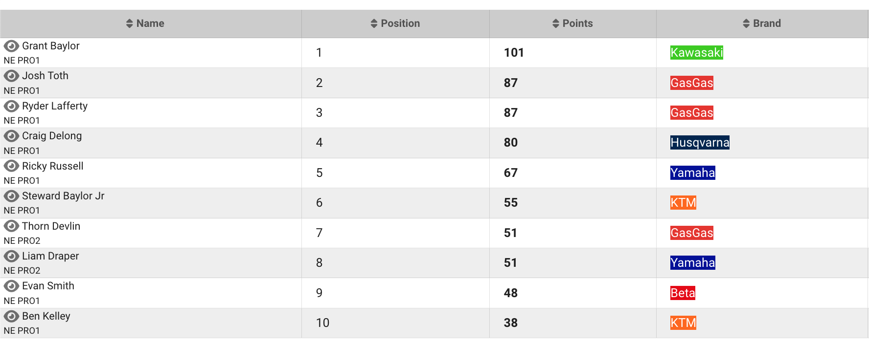 | Position | Rider | Hometown | Points |