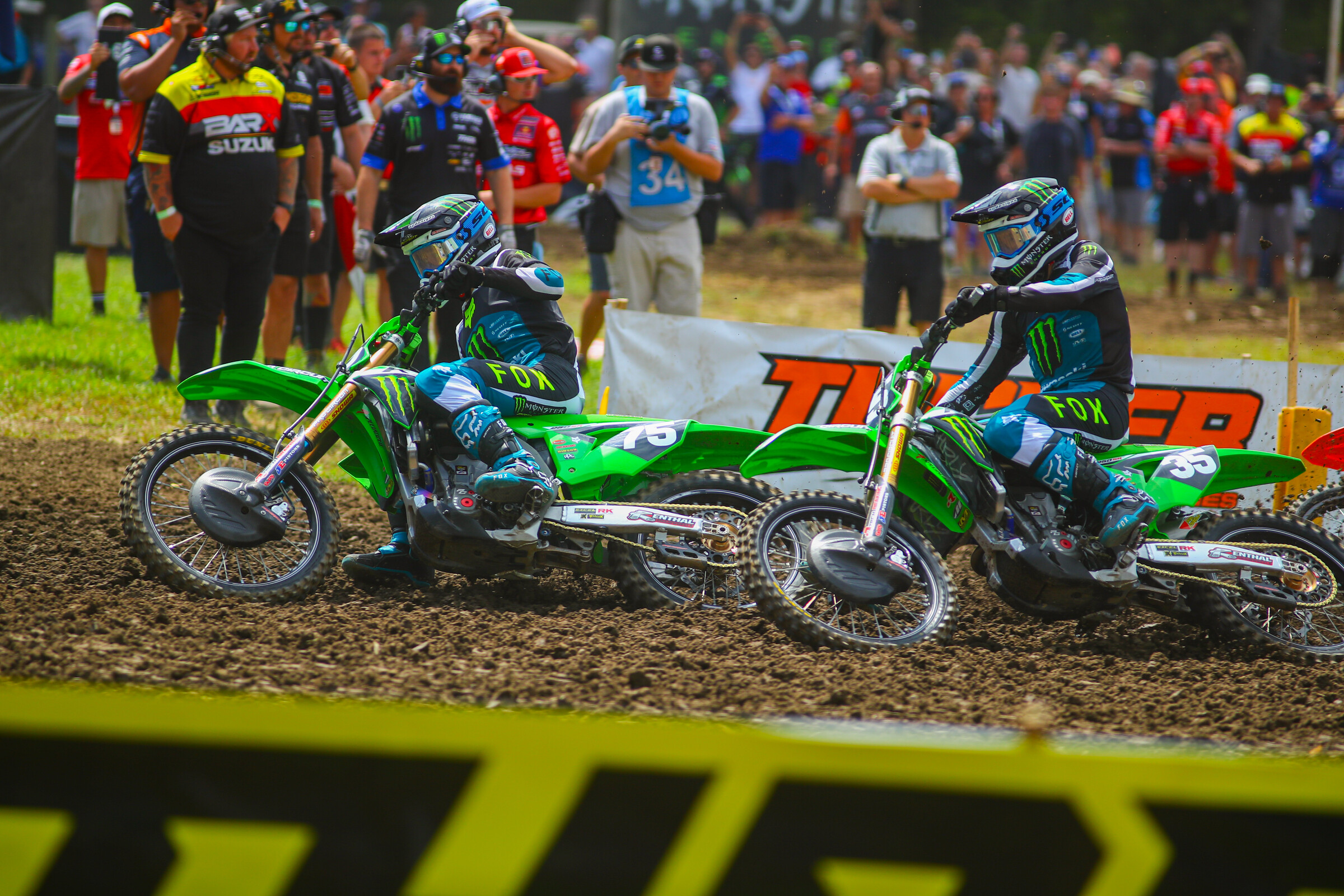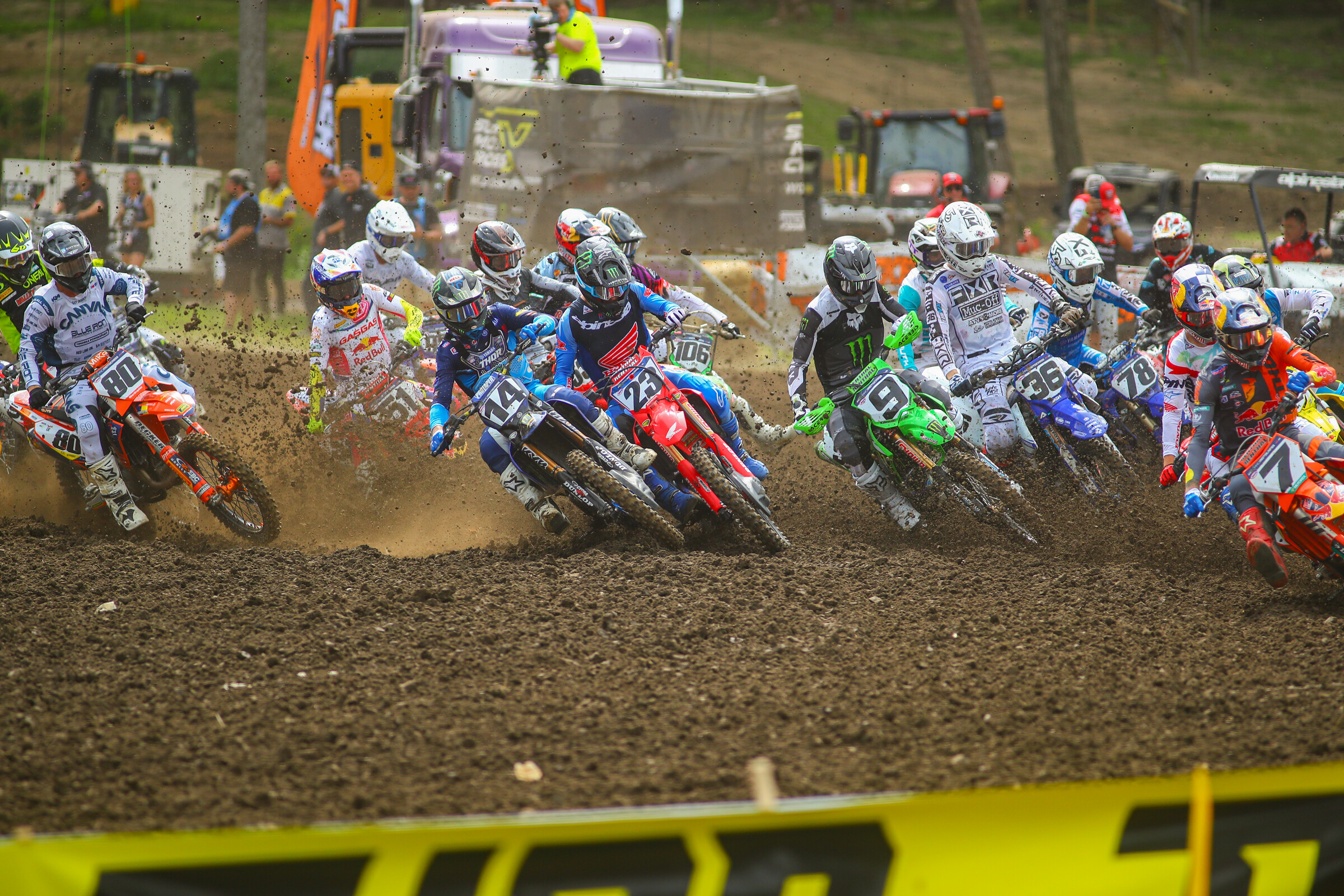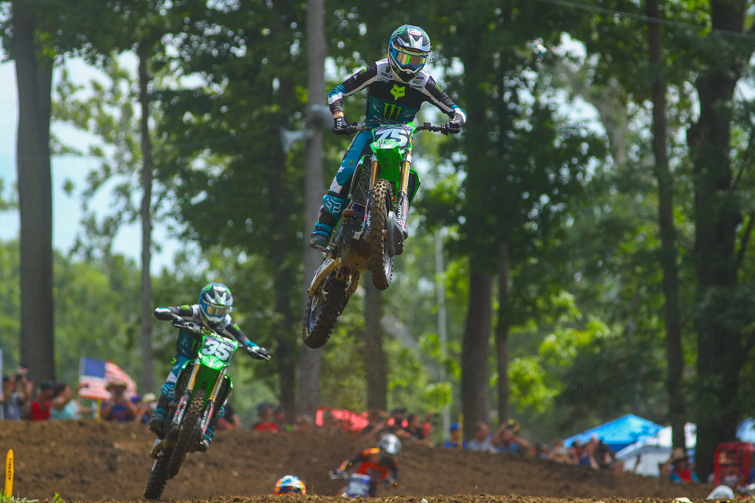 “I saw the chaos in the second turn,” Hunter Lawrence said after the race. “I saw blue bikes and then the No. 32 and thought, ‘That sucks.’ I was way, way back, trying to be patient and trying not to rush anything. Man, what a year. Never say die, never give up. It’s unbelievable. So honored to thank the team with five championships, and the year’s not done.”