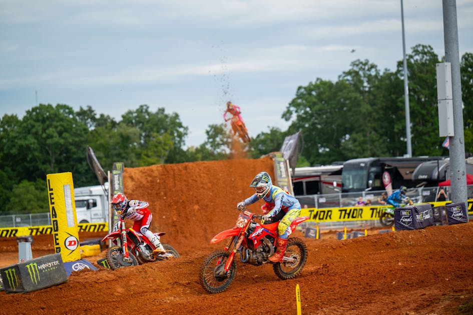 The first ever SuperMotocross World Championship event featured quite a unique mix of strategy with the technical supercross aspects mixed with some high speed motocross elements. But perhaps the biggest takeaway from the track is we saw maybe the best working split-section ever and this one was with the track completely breaking away. Hear what Chase Sexton had to say about it as well as what happened to Jett Lawrence, Adam Cianciaurlo's crazy near-save, Sexton's quick pass for the lead, Hunter Lawrence's rough day, Jo Shimoda's brilliant outside line pass, and more from Charlotte!