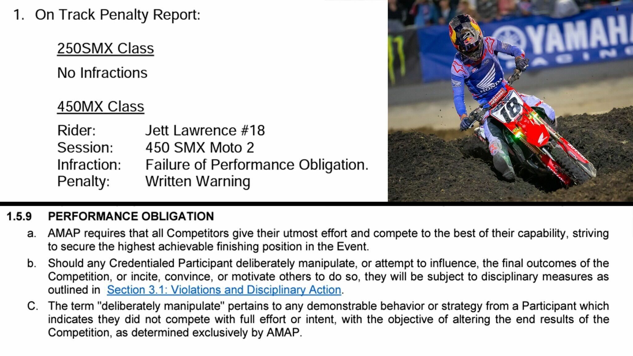 Jett Lawrence's decision to wave Ken Roczen around him in the second moto of Saturday's SMX race at Chicagoland Speedway has certainly garnered its share of opinions. There's now an official take from AMA Pro Racing, via the weekly penalty report released today. Lawrence has received a written warning for violating the rules below.