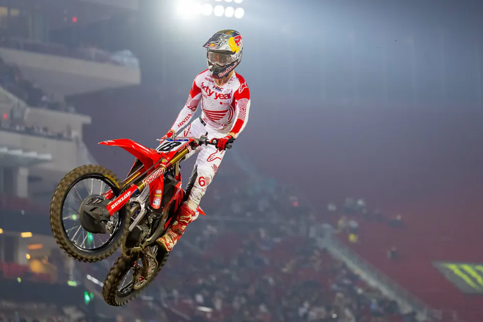 In the final moto with the 450SMX championship on the line, Jett Lawrence just about threw it all away as he spun off the face that claimed Justin Barcia earlier in the night. Lawrence went into a full panic rev mode and adjusted his body positioning trying to save an endo from occurring. Luckily, he went just far enough to essentially downside the knuckle of the triple-in with his front wheel and managed to save it despite getting sideways on landing. Given the implications with the title on the line, this save alone may be the most expensive save in the history of AMA racing.