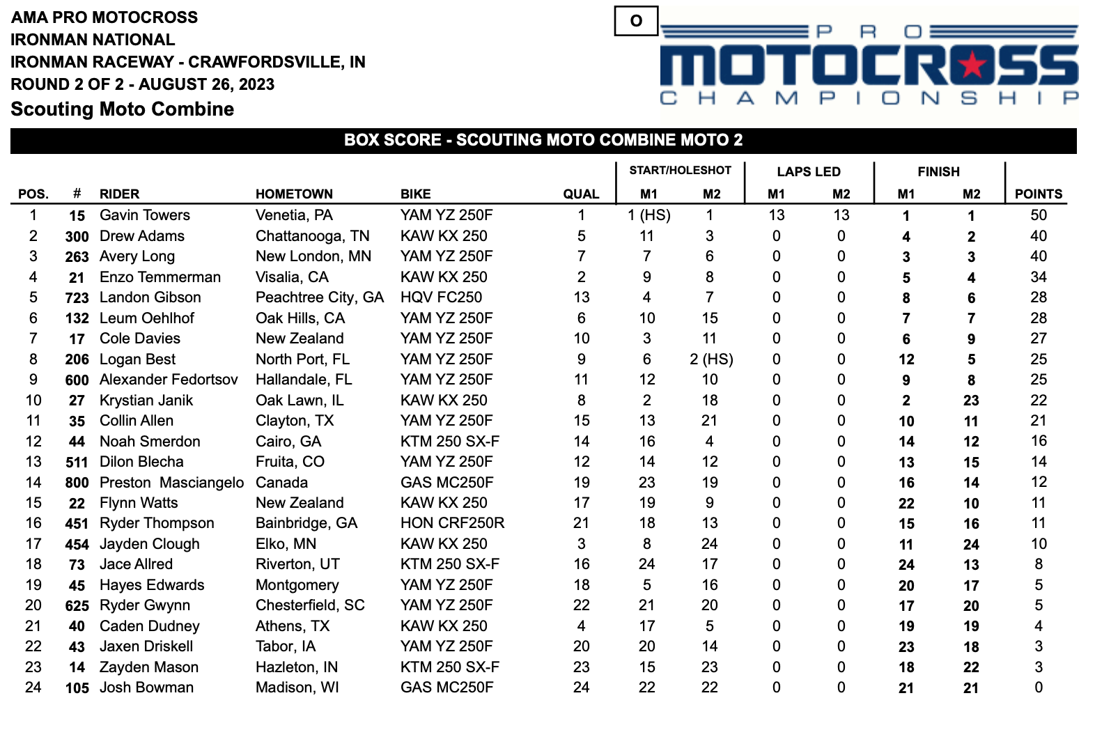 Jeff Stanton, Chad Reed, Broc Tickle, Michael Byrne, and Daniel Blair talk about the Ironman Scouting Moto Combine at Ironman Raceway. This was the second Scouting Moto Combine event of the summer, held in August, and was won by Gavin Towers, who finished 1-1 in his debut with the Monster Energy Yamaha Star Racing team. Kawasaki’s Drew Adams (4-2 finishes) and Yamaha’s Avery Long (3-3 finishes) rounded out the overall podium.