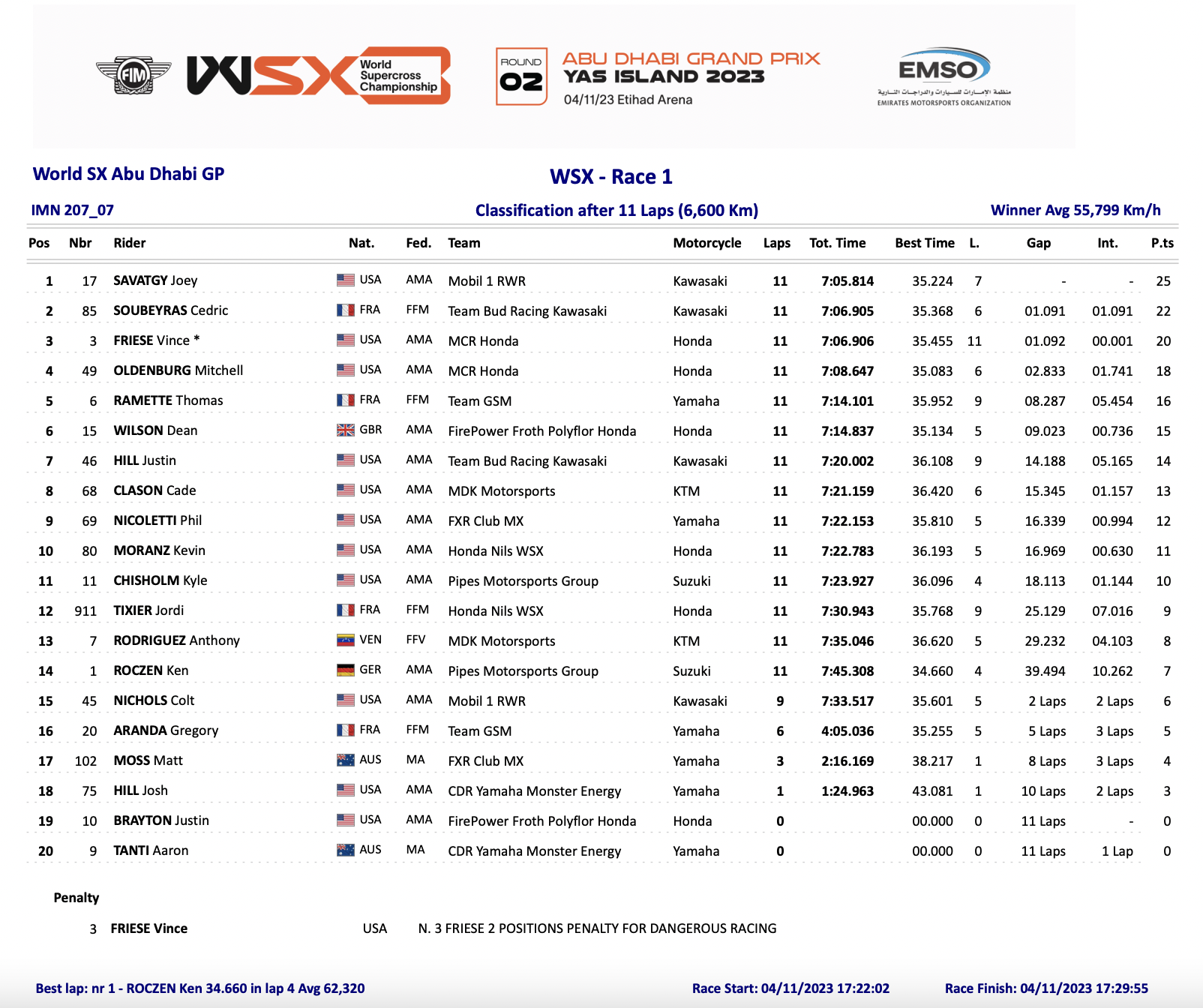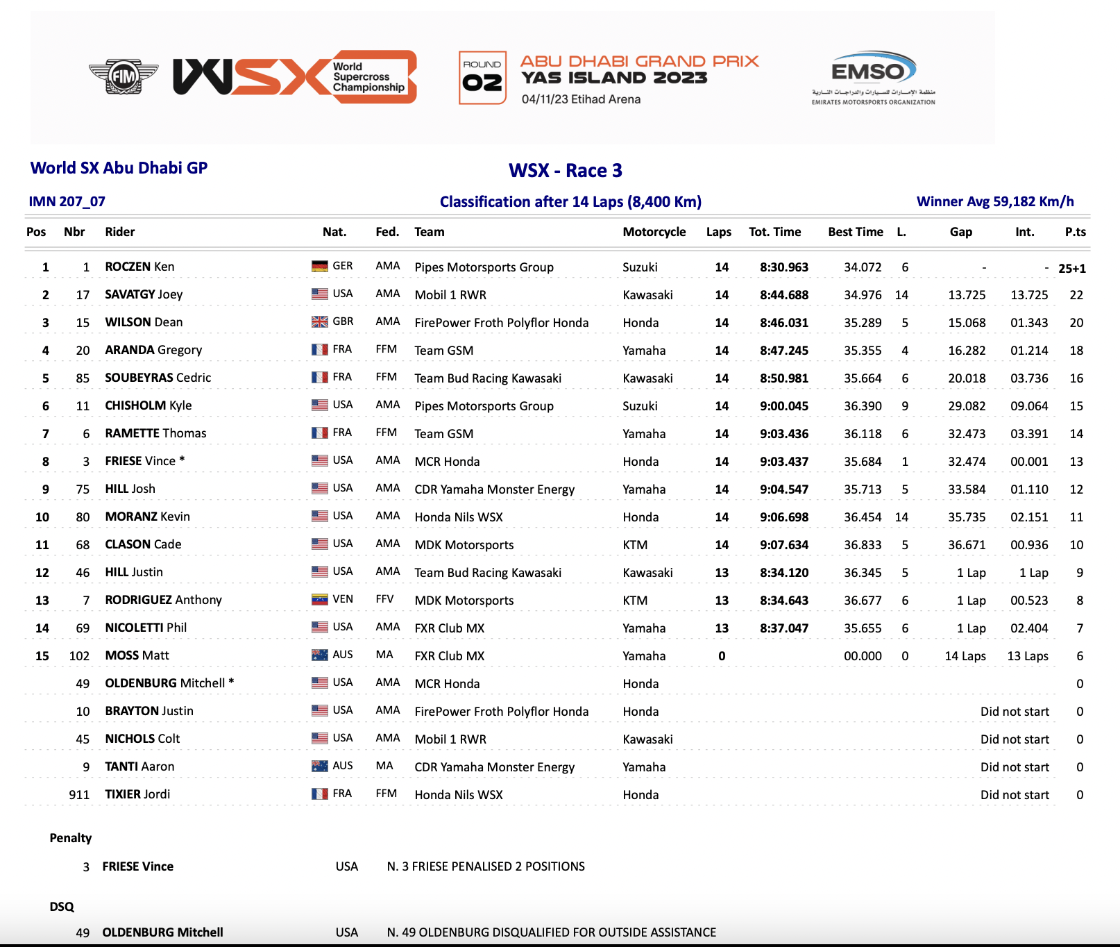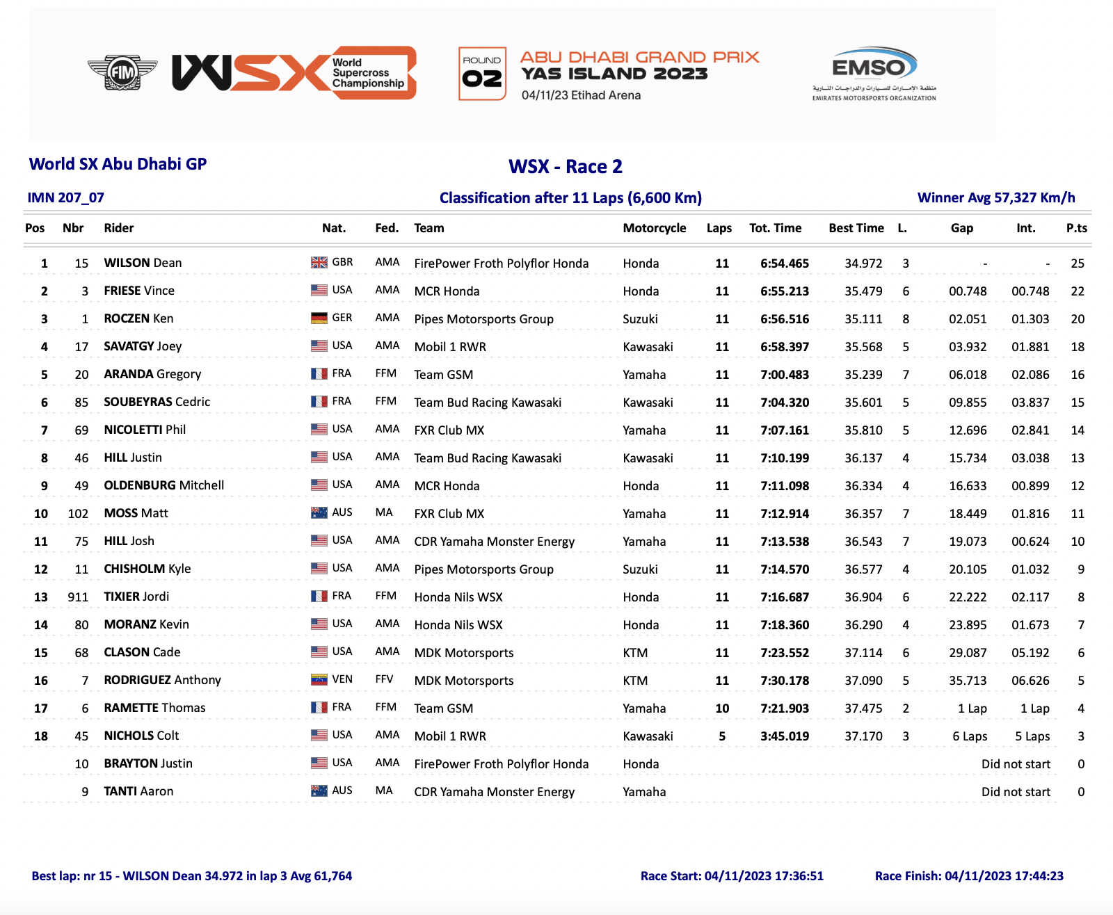 The FIM World Supercross Championship resumed for its second round of 2023 and the first-ever WSX event in Abu Dhabi at Etihad Arena. Joey Savatgy emerged the WSX 450cc class winner and took over the WSX points lead on his Rick Ware Racing/Mobil 1 Kawasaki, surviving a night of ups and downs for everyone. Savatgy went 1-4-2 to snag the overall in the three-race format. Firepower Honda's Dean Wilson and MotoConcepts Vince Friese took second and third overall. Ken Roczen, the series' leader coming into the event, had troubles in qualifying and had to overcome a bad start in race 1, he got to Friese to try to take the lead on the last lap but crashed, and instead finished 14th. Roczen ended up 14-3-1 on the night fighting through the pack, and by finishing fourth overall, loses the points lead to Savatgy with one race remaining.