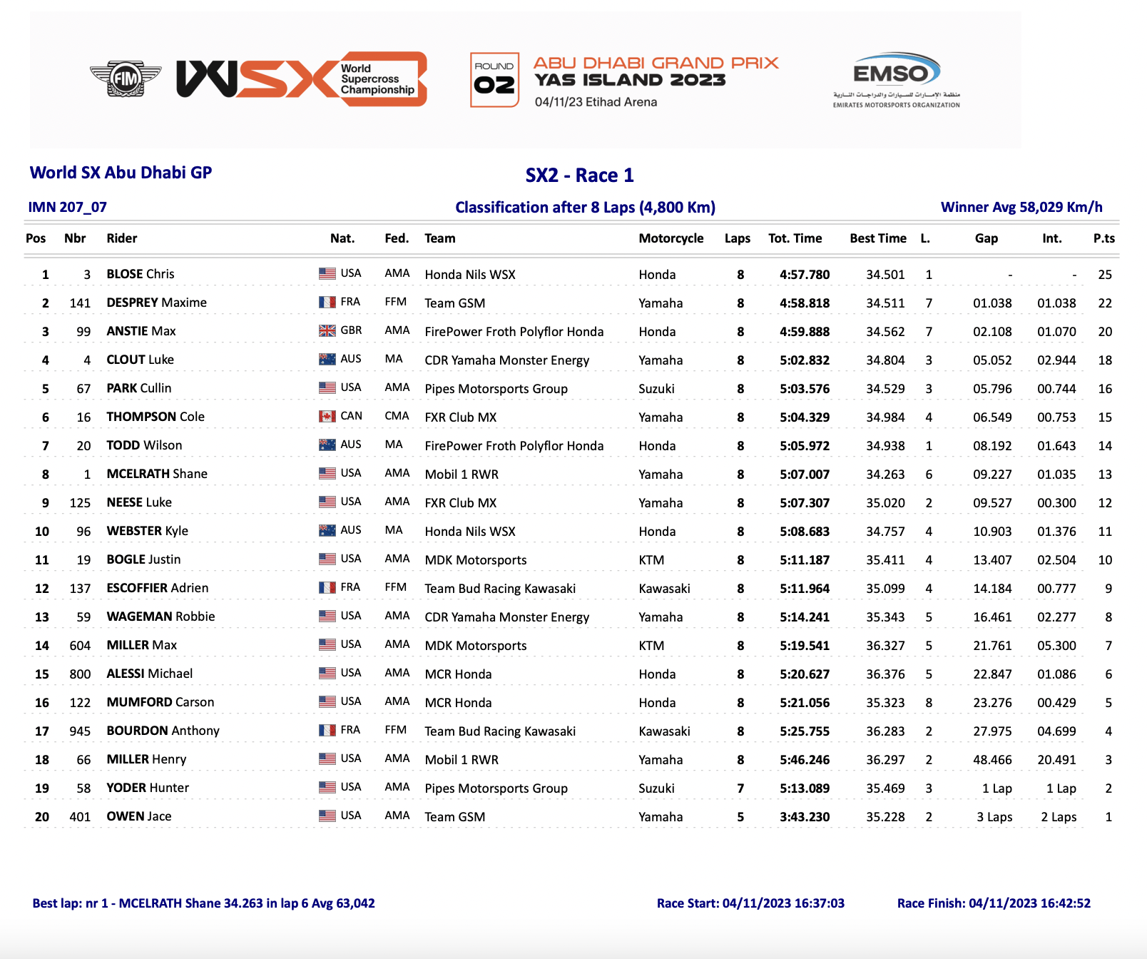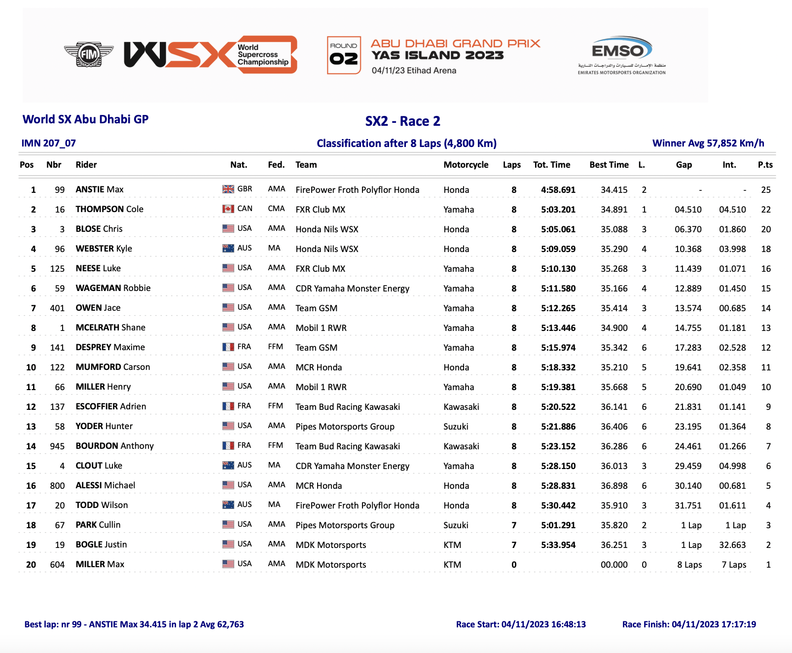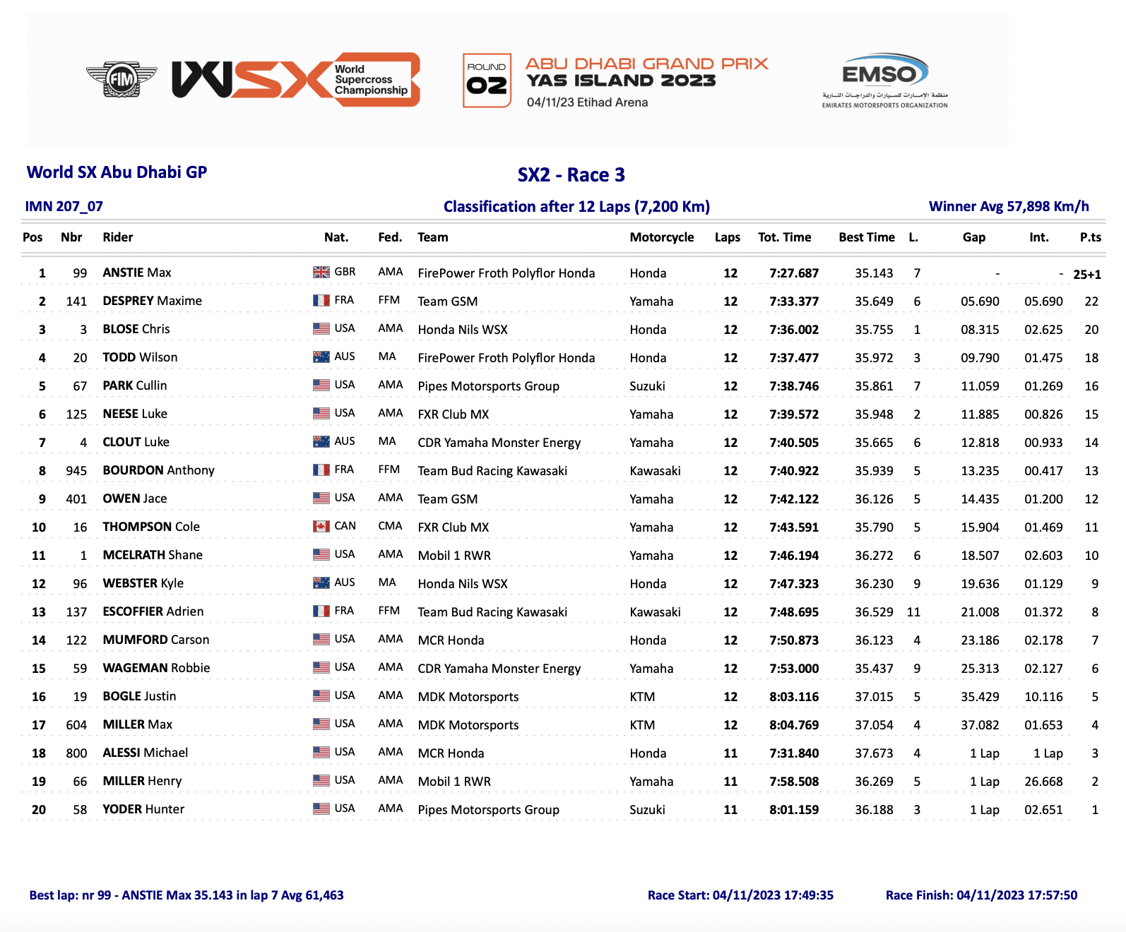 The FIM World Supercross Championship resumed for its second round of 2023 and the first-ever WSX event in Abu Dhabi at Etihad Arena. Joey Savatgy emerged the WSX 450cc class winner and took over the WSX points lead on his Rick Ware Racing/Mobil 1 Kawasaki, surviving a night of ups and downs for everyone. Savatgy went 1-4-2 to snag the overall in the three-race format. Firepower Honda's Dean Wilson and MotoConcepts Vince Friese took second and third overall. Ken Roczen, the series' leader coming into the event, had troubles in qualifying and had to overcome a bad start in race 1, he got to Friese to try to take the lead on the last lap but crashed, and instead finished 14th. Roczen ended up 14-3-1 on the night fighting through the pack, and by finishing fourth overall, loses the points lead to Savatgy with one race remaining.