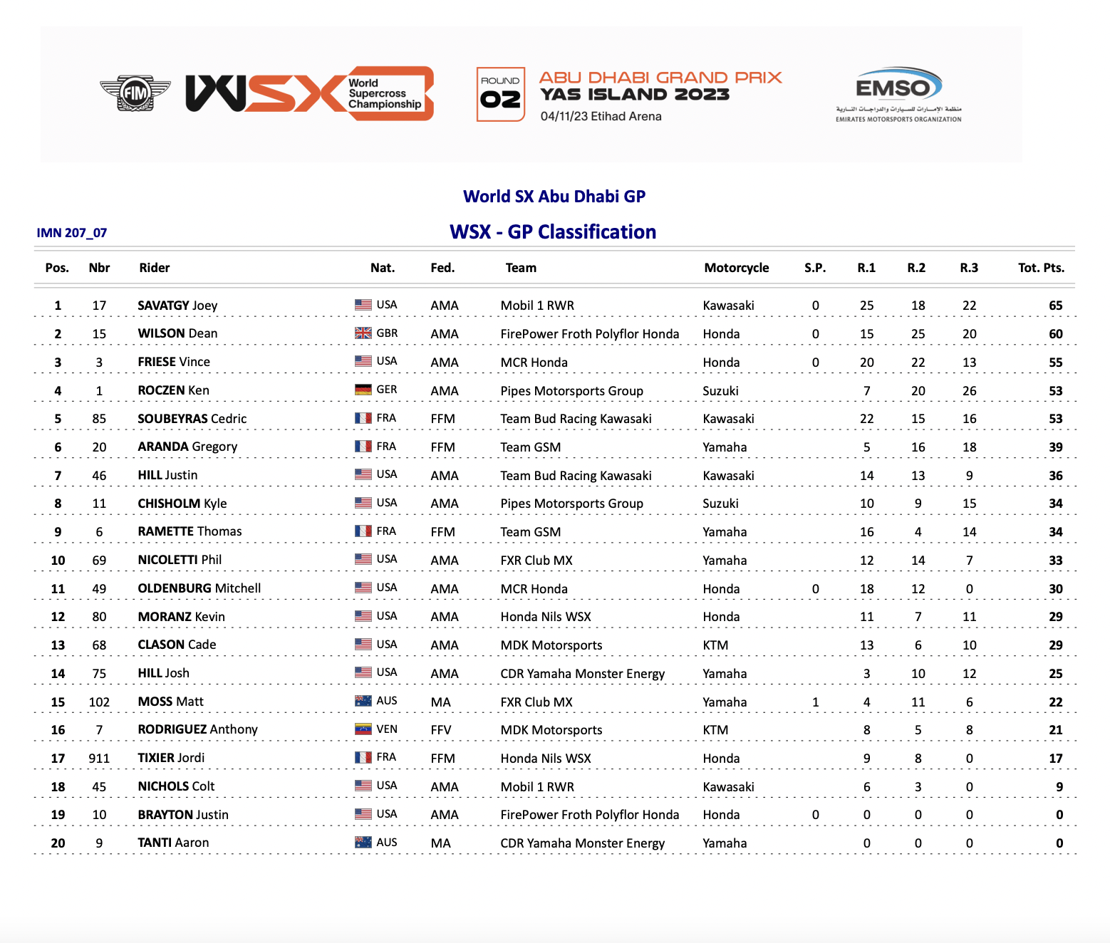 Savatgy was battling Friese hard in the third and final race, a pack stacked up behind him because Friese was protecting every line in every corner, which is the slower way around the track. Savatgy tried a block pass in a corner. Friese went off the track and then rejoined in front of Savatgy again. He was later penalized two spots for that, but even with two two-position penalties, Friese ended up third overall. Wilson was second, lamenting he had a rare chance to score a win over Roczen based on Roczen’s start position, but it got away from him with that Friese block pass. Most of the racing centered around the attempts to pass Friese, a dynamite starter who controlled things from the front the whole night. Further, in this series Friese has a real shot at race wins, a title, and money. This track perfectly rewarded his starts and style, and unless the penalties become so severe that they completely ruin his chances for a result, there’s no reason for him to stop. Further, the Abu Dhabi race was the perfect storm, as this was a first-time event with first-time event teething problems. The crowd was definitely excited and into seeing supercross for the first time. That was good as a first-time event. But a lot of the track equipment broke, which meant the final angles of the berms, whoops and other obstacles weren’t ideal (WSX CEO Adam Bailey explained this on his recent Fly Racing/Racer X podcast with Steve Matthes). A few small tweaks might have created more variance and passing, but as it was, the track was perfect for someone like Friese to hold up the field.