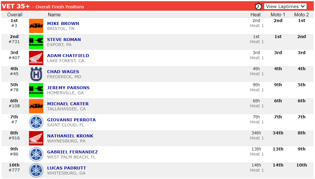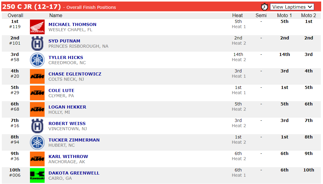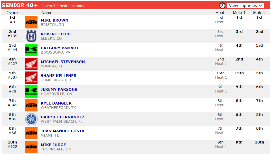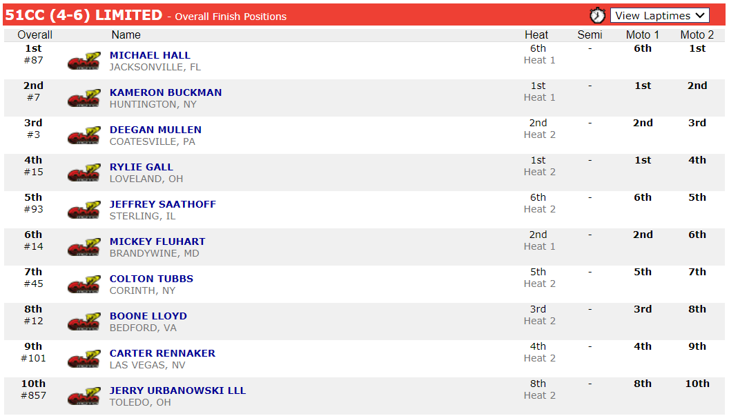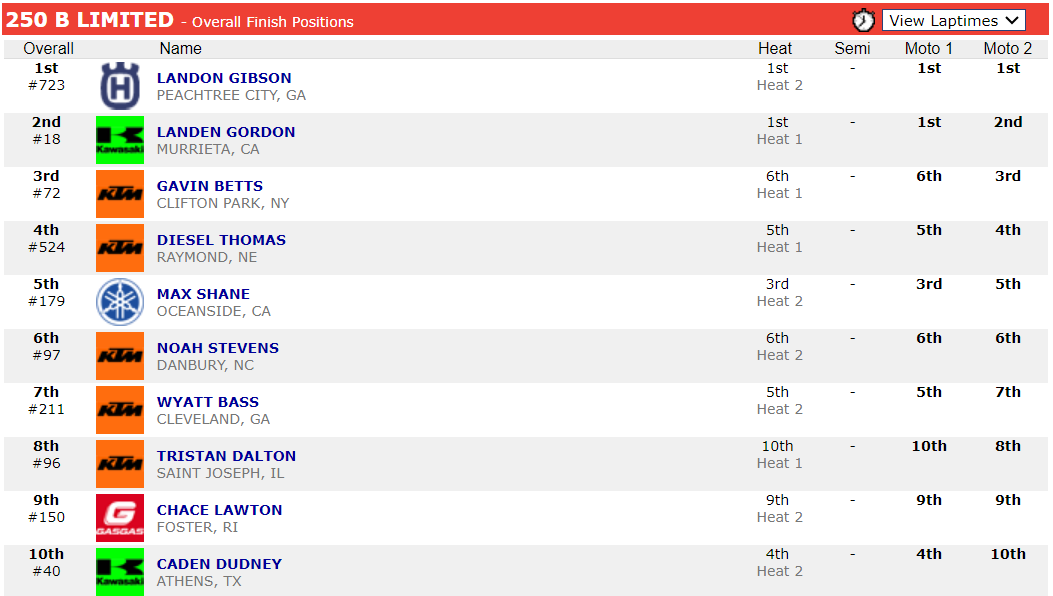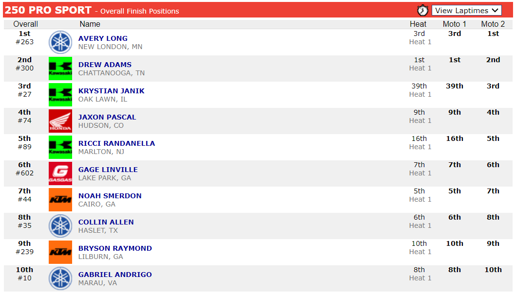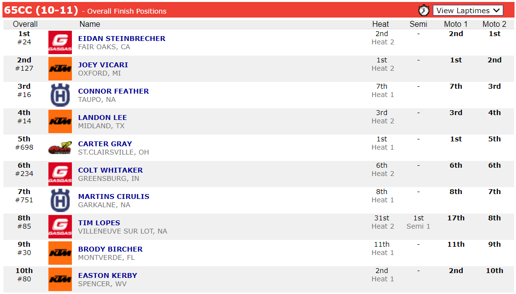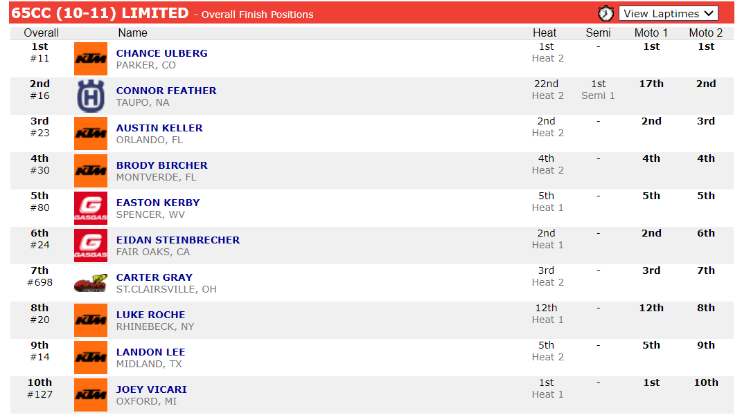 Here are the top ten overall finishes from each class. To view the full results, visit https://resultsmx.com/liveview/class.asp?c=&e=270&s=