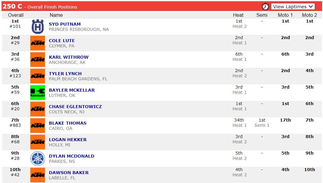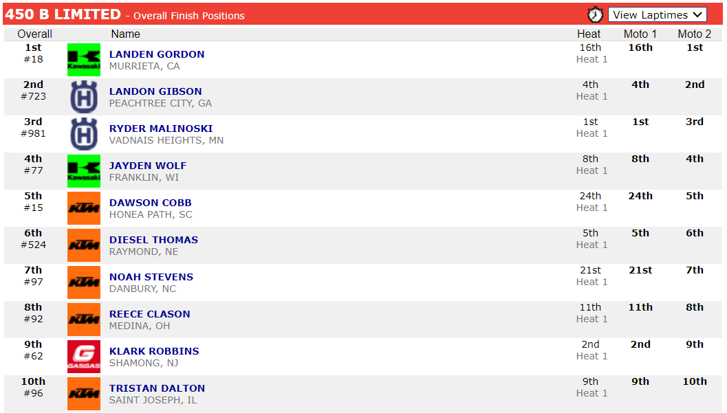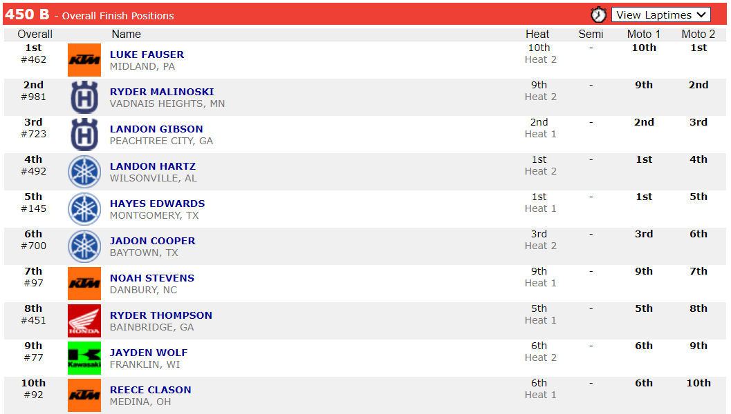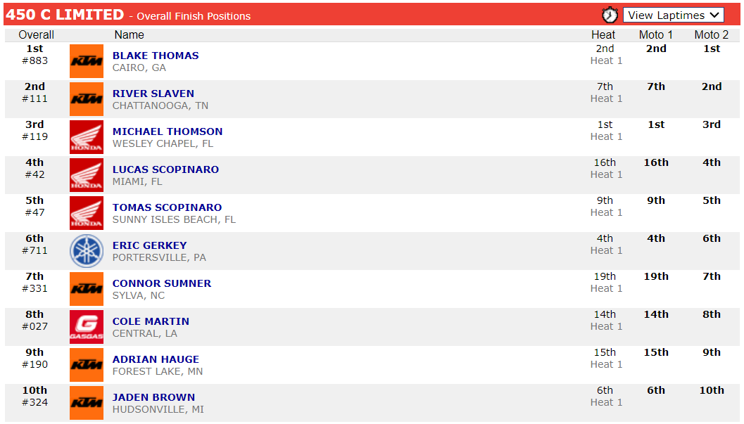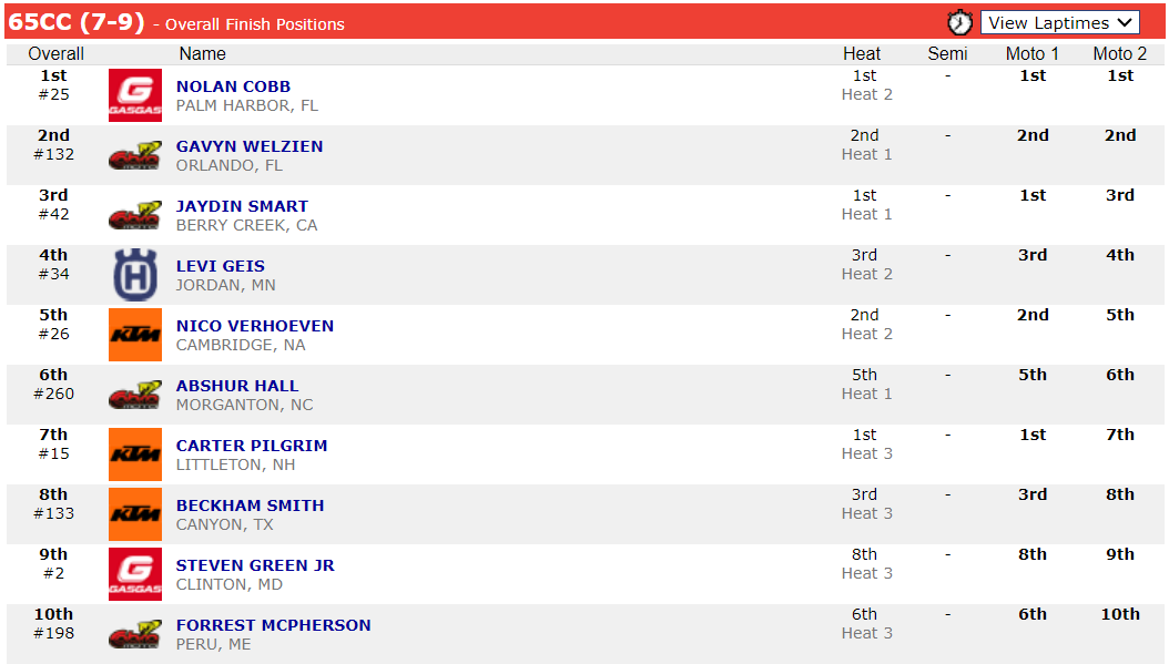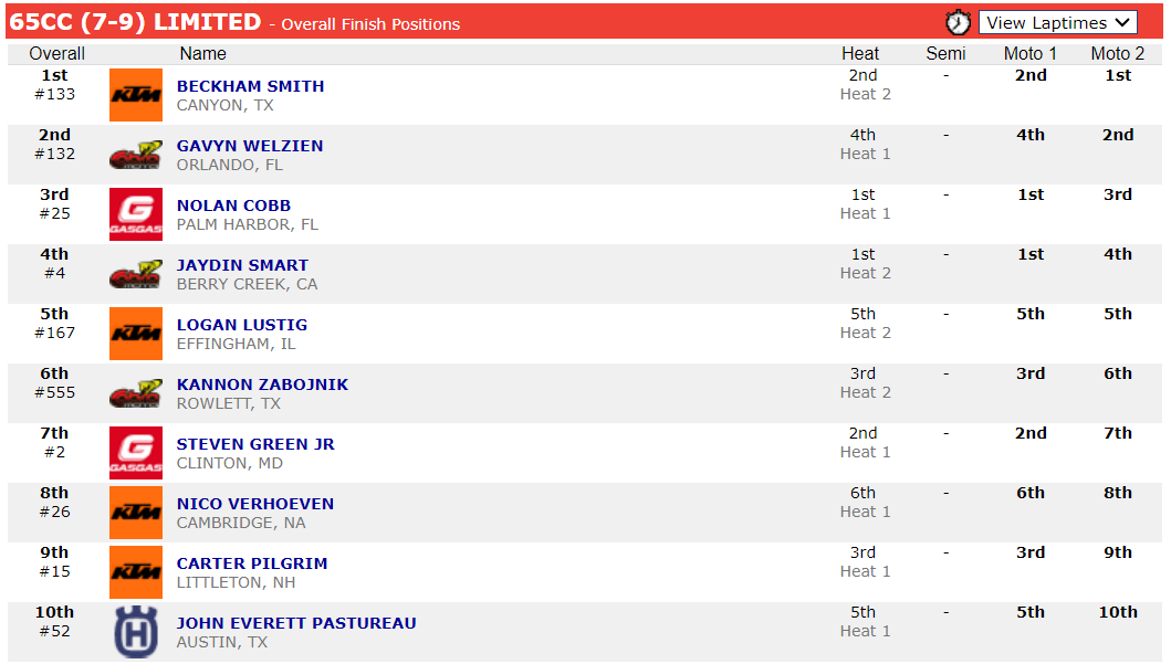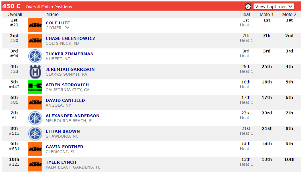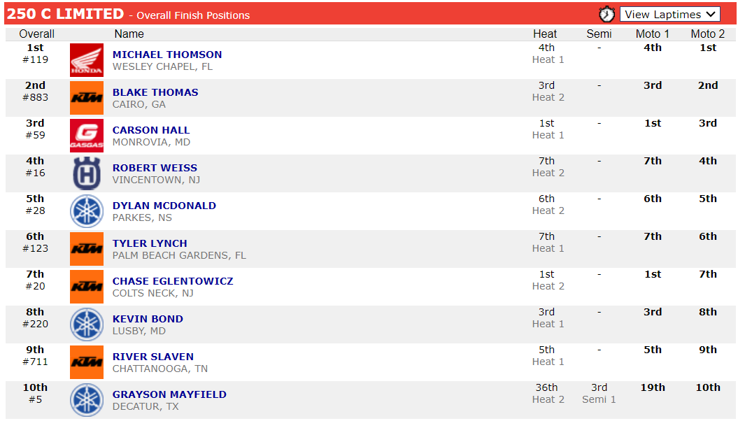 Here are the top ten overall finishes from each class. To view the full results, visit https://resultsmx.com/liveview/class.asp?c=&e=270&s=
