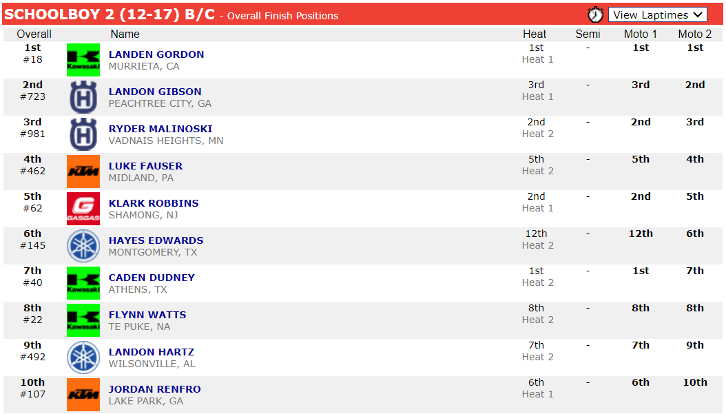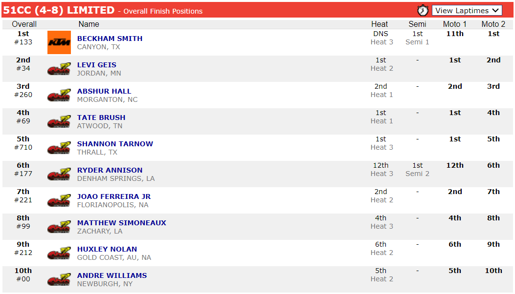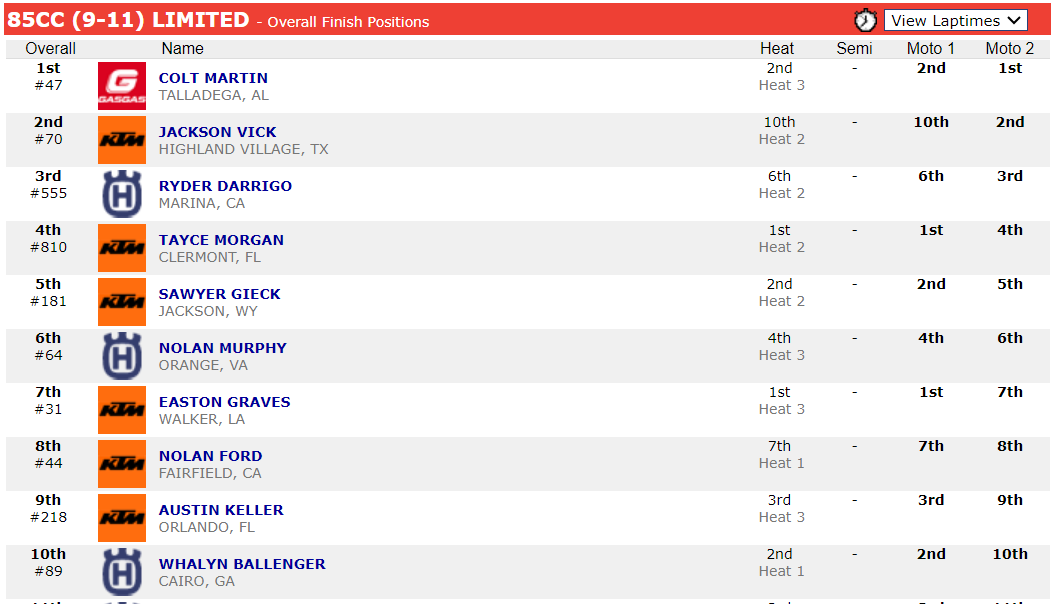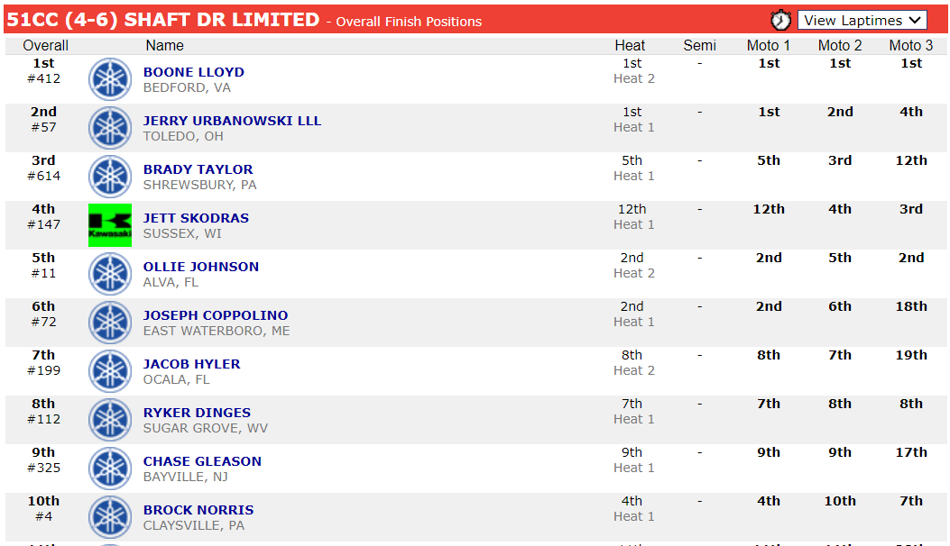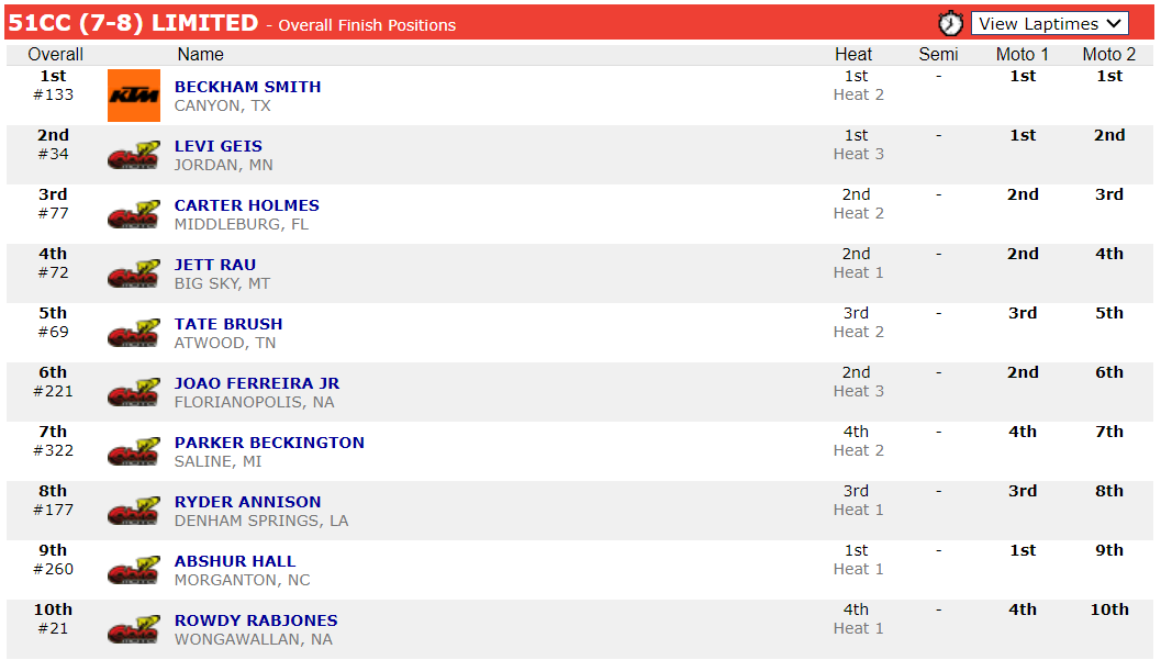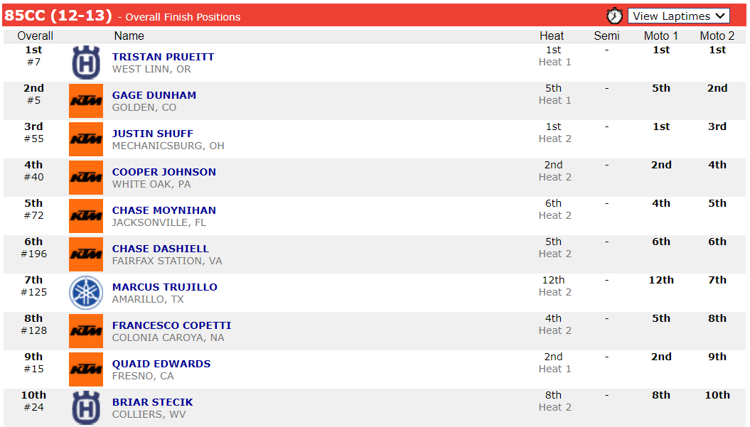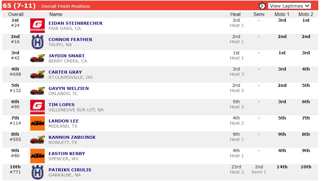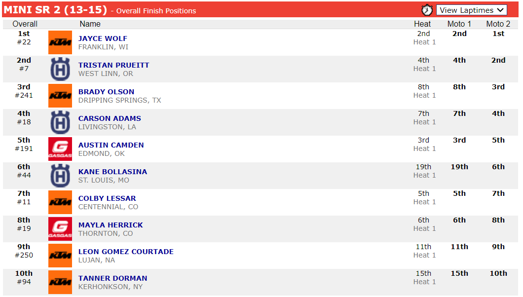 Here are the top ten overall finishes from each class. To view the full results, visit https://resultsmx.com/liveview/class.asp?c=&e=270&s=