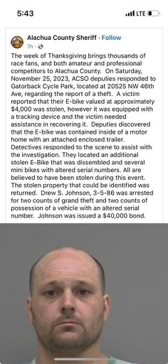 "The week of Thanksgiving brings thousands of race fans, both amateur and professional competitors, to Alachua County. On Saturday, November 25, 2023, ACSO deputies responded to Gatorback Cycle Park, located at 20525 NW 46th Ave, regarding the report of a theft. A victim reported that their E-bike valued at approximately $4,000 was stolen, however it was equipped with a tracking device and the victim needed assistance in recovering it. Deputies discovered that the E-bike was contained inside of a motorhome with an attached enclosed trailer. Detectives responded to the scene to assist in the investigation. They located an additional stolen E-bike that was dissembled and several mini bikes with altered serial numbers. All were believed to have been stolen during the event. The stolen property that could be identified was returned. Drew S. Johnson, 3-5-86, was arrested for two counts of grand theft and two counts of possession of a vehicle with an altered serial number. Johnson was issued a $40,000 bond."