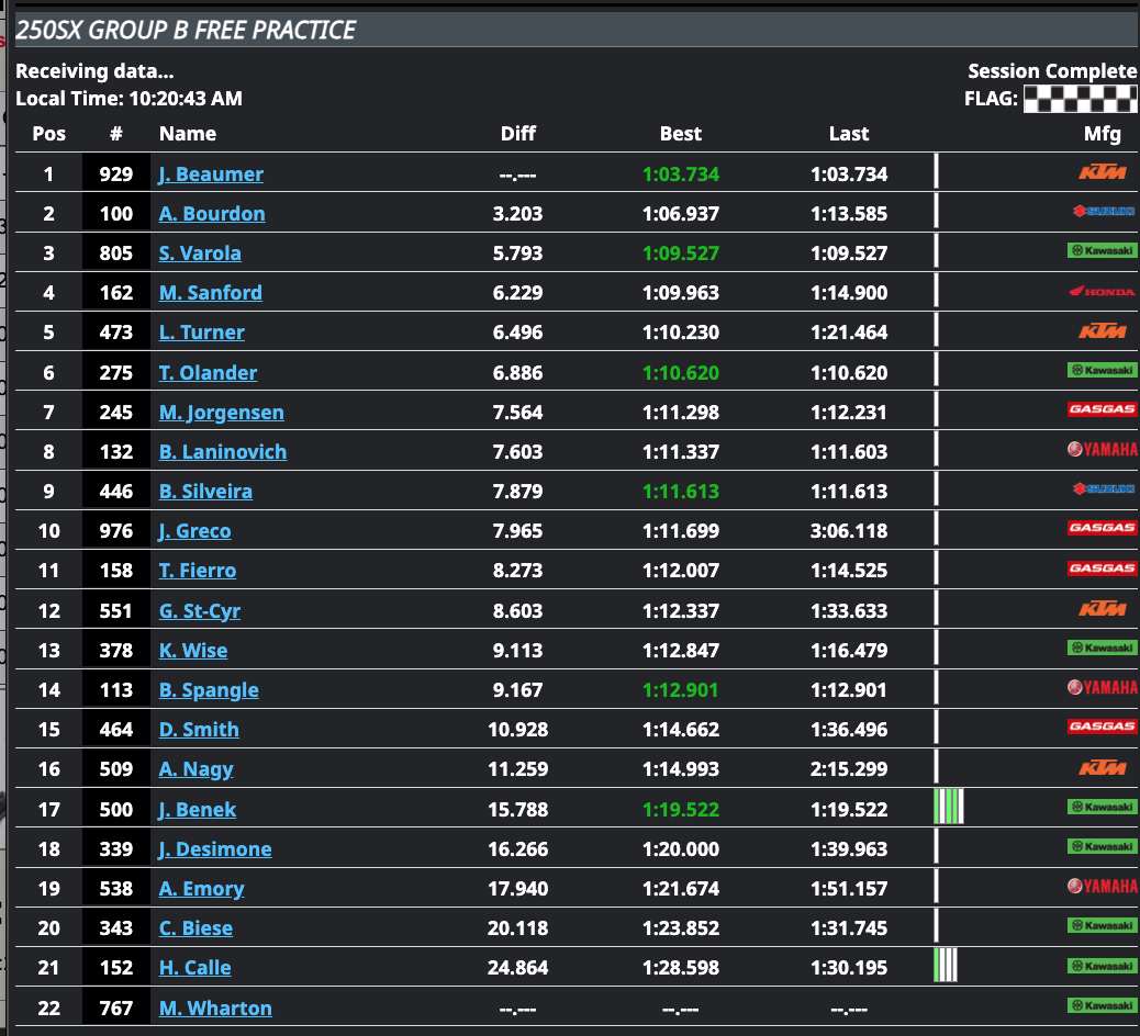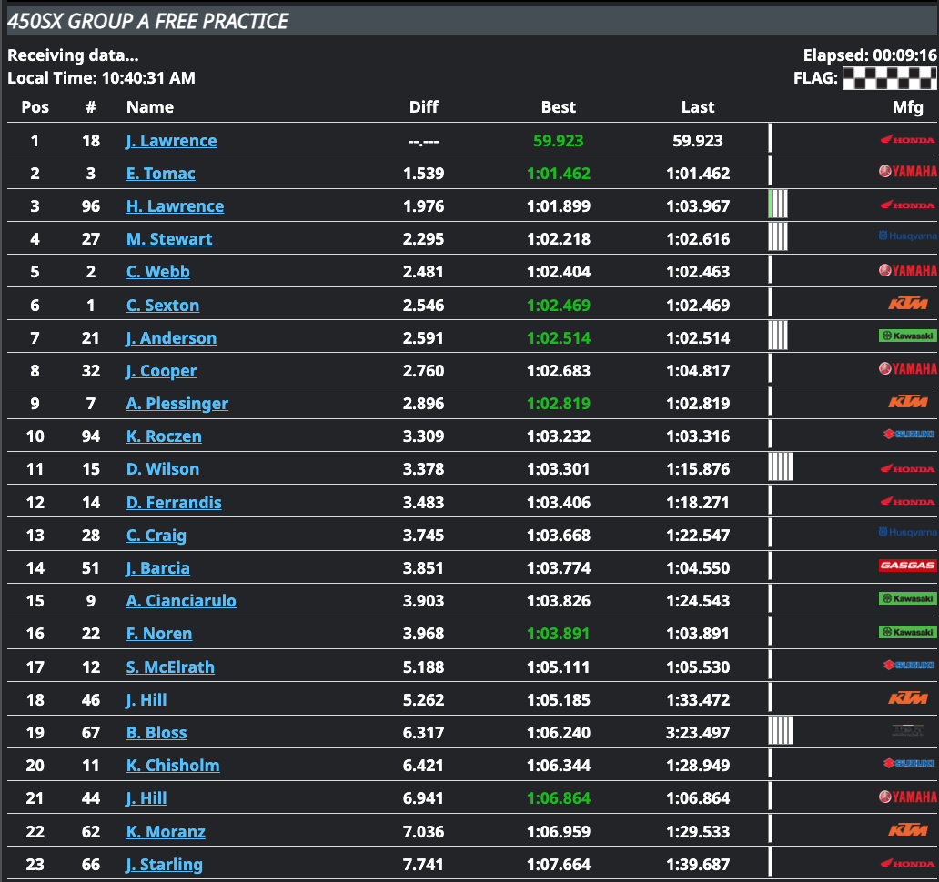 Timing and scoring was not working during the 250SX group A free practice, so where do not have any lap times for that session.