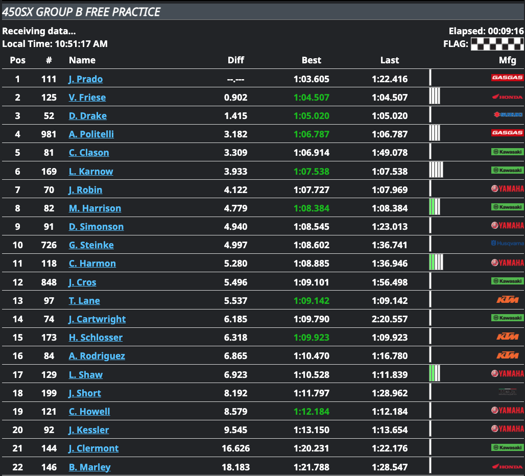 In the 450SX group B session, it was Jorge Prado’s 1:03.568 that topped the field over Vince Friese (1:04.365) and Derek Drake (1:04.731).