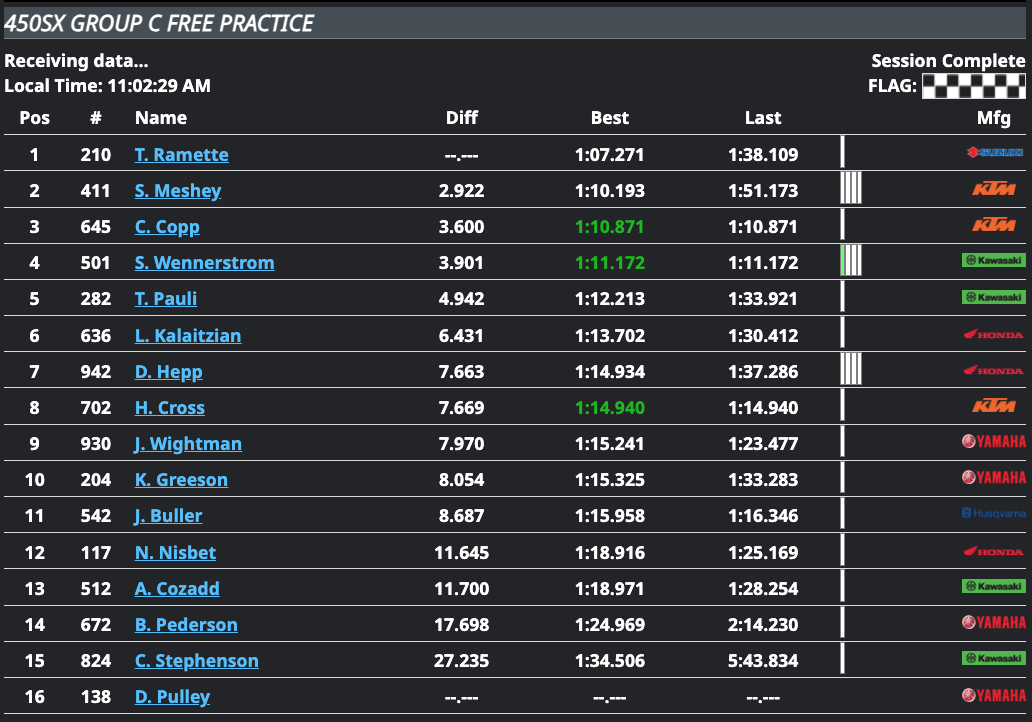 | 3 | Cooper Webb | +0.019 | 1:00.748 | Newport, NC | Yamaha YZ450F | |