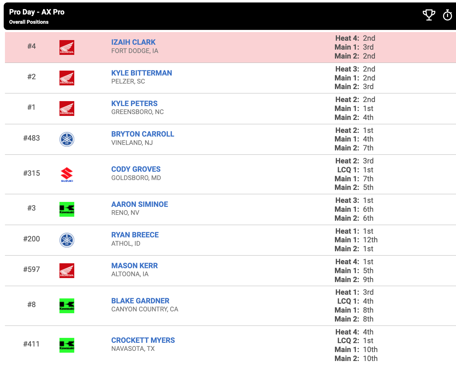 | 2 | Jordon Smith | +3.138 | 1:03.777 | Belmont, NC | Yamaha YZ250F | |