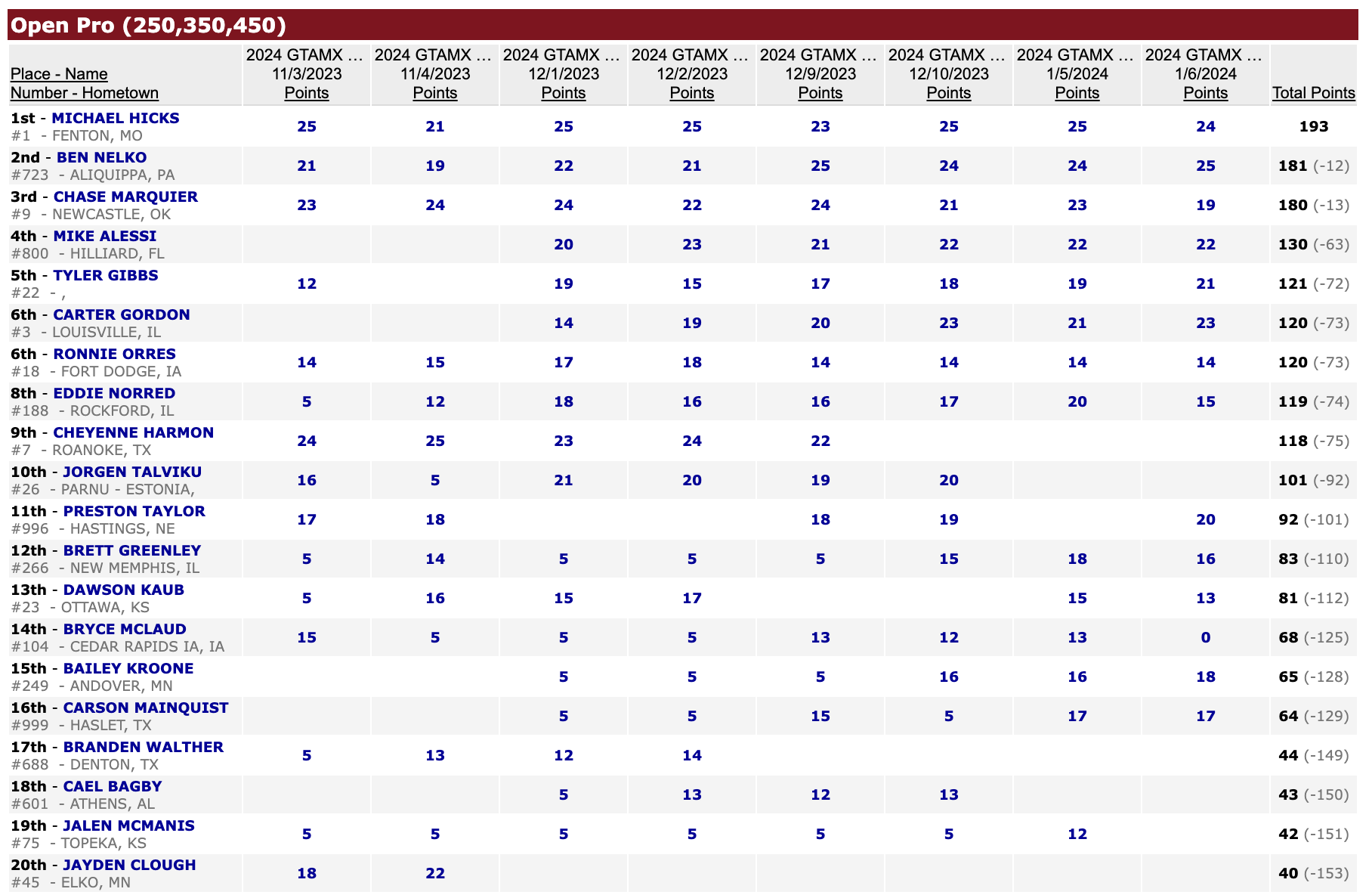 January 6, 2024| Rider | Time | Interval | Best Lap | Hometown | Bike | |
