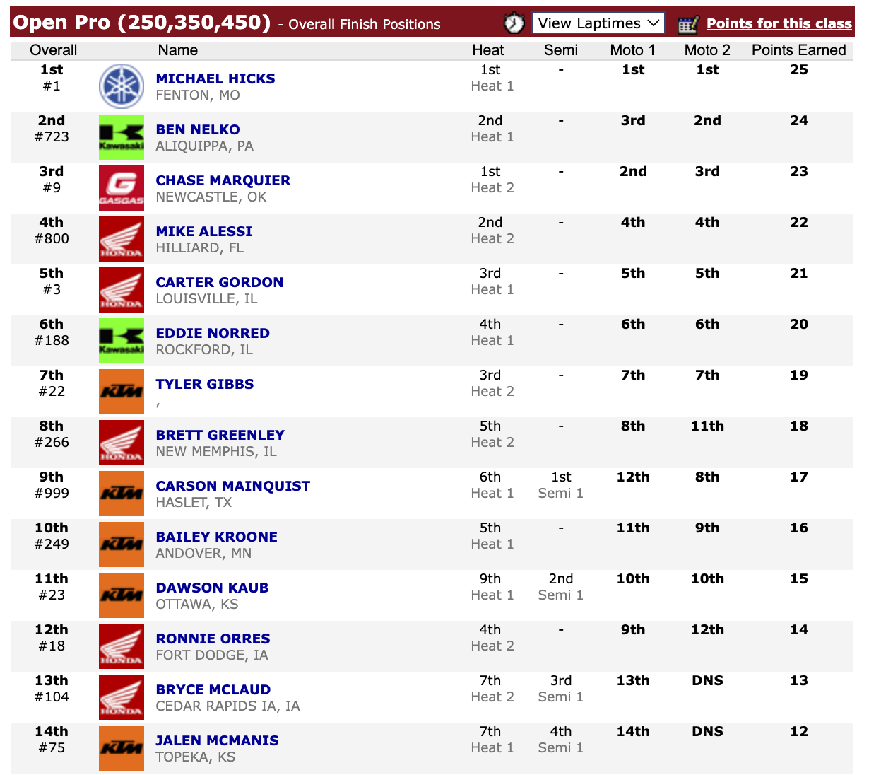 | 3 | Chase Sexton | +13.815 | 1:02.546 | La Moille, IL | KTM 450 SX-F | |