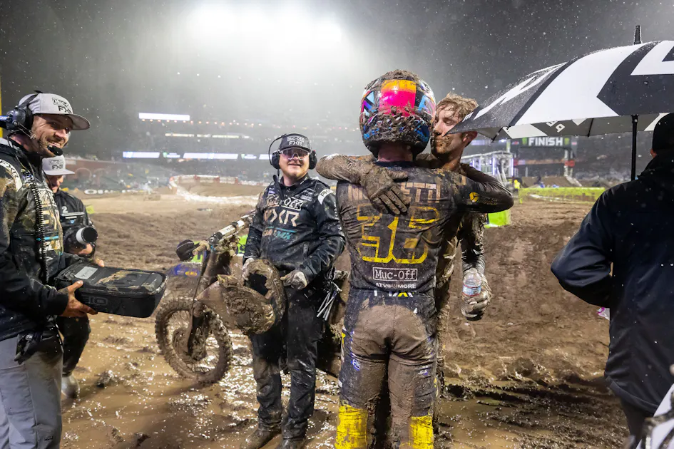 Monster Energy AMA Supercross in San Francisco saw the skies open up, to gave us one of the worst mud races we have seen in years. The main event saw riders rolling the jumps and most commented that it was strictly survival, both for themselves and their machines. That sometimes open the door for those who need a boost, and the privateer team Muc-Off FXR ClubMX Yamaha saw their riders Garrett Marchbanks and Phil Nicoletti battling for a podium position on the last lap. Marchbanks sat down with the media in the post-race press conference, while our Kellen Brauer caught up with Nicoletti after the race to hear about their nights.