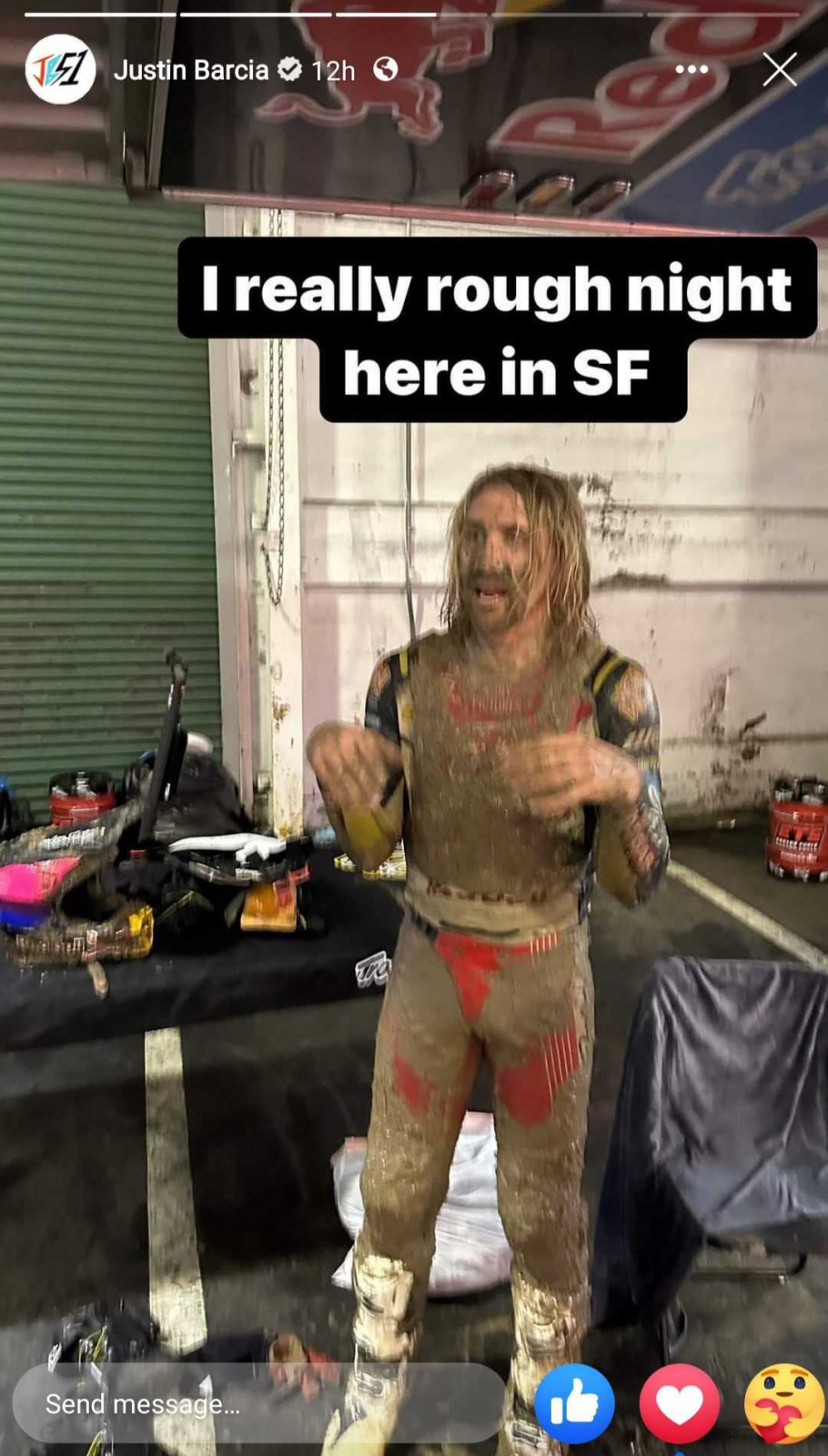 “HOLY F😲ck . That was gnarly😭Made it into main from the heat.. not really but watch the choob to see how😂😂 Main Event I wobbled about with my feet off the pegs for 20 minutes. Got into 14th last lap and fell 😭 What a mess but glad to get through it. The San Fran fans were epic!! Standing in the rain all night watching us goon out! Thanks guys🍻Big thanks to my Mechanic, Team, Gear & Goggle helpers for bustin themselves all day for us👊”