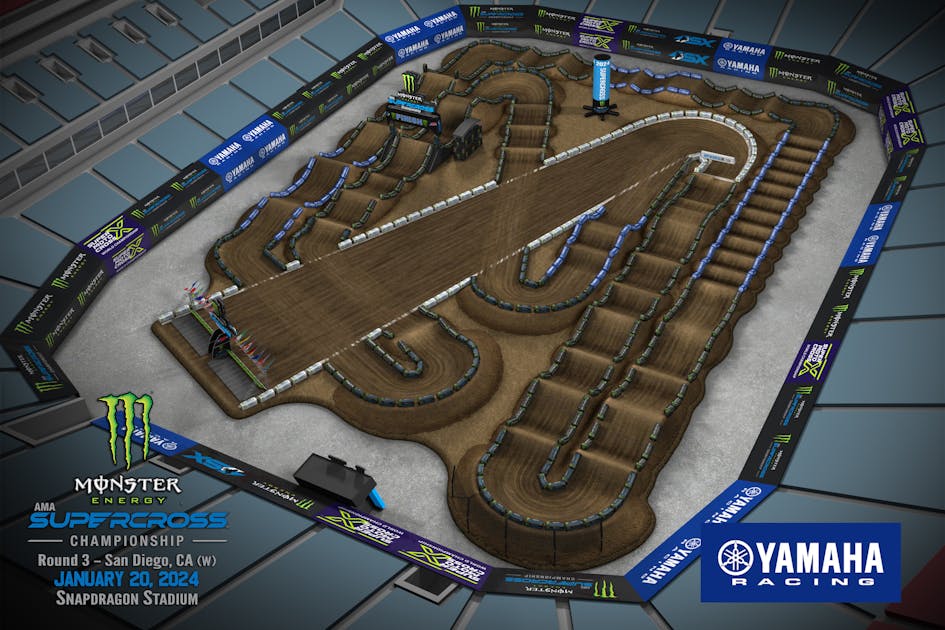 The 2023 San Diego Supercross round of Monster Energy AMA Supercross Championship takes place this weekend on January 20. Take a lap around Snapdragon Stadium in San Diego, California. This will be the third round of the 17-round championship. This weekend will also be the 50th anniversary themed-night for AMA Supercross, so expect to see some throwback/old school jerseys and bikes. One note on this weekend's track is that this is the second of only two supercross rounds with a right-hand first turn in 2024 (the other was the A1 opener).