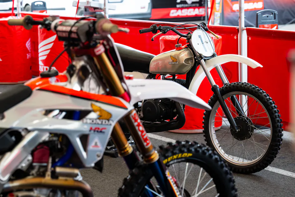The current Honda HRC CRF450Rs with the old school Honda Elsinore. Align Media ![Hunter Lawrence's Honda CRF450R.]()