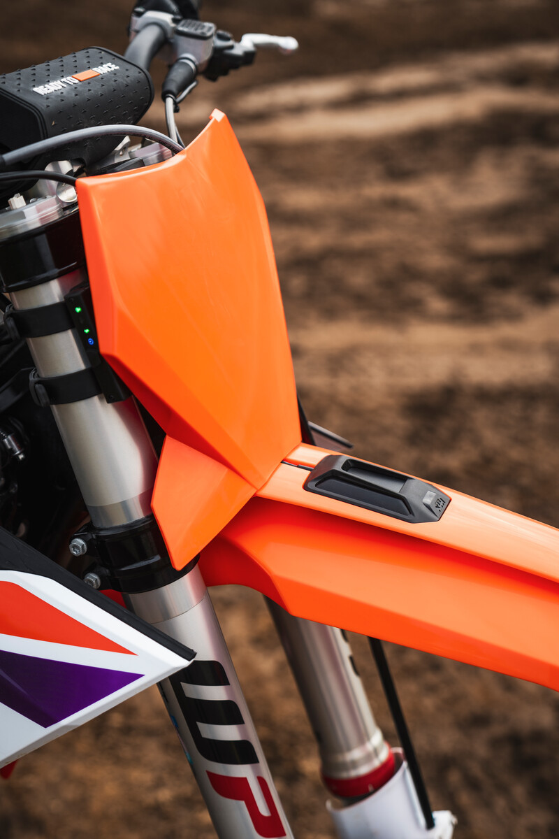 The advantages are three-fold: simplistic engine management and suspension set-up and full-blown analysis through the RIDER section of the KTMConnect App. The CUO is a two-part system mounted between the right fork leg and the GPS component on the redesigned front fender. Racers and users can now activate a series of wireless connectivity functions to fully customize their KTM for a variety of track conditions, and dissect and improve their own on-track efforts.