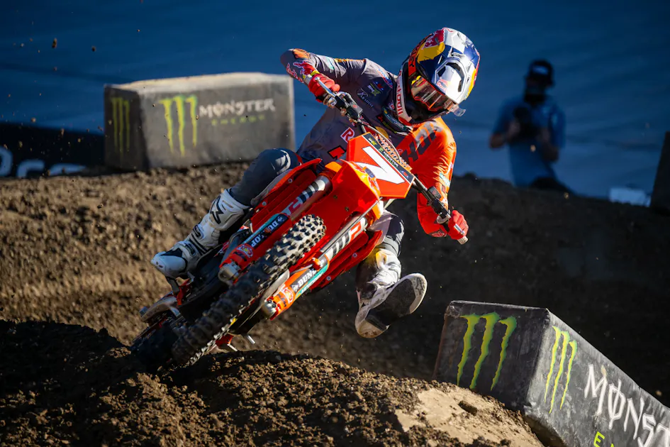The first 450SX main event went firing into the first turn and it was Chase Sexton narrowly grabbing the holeshot ahead of Jorge Prado. Jett Lawrence went down in the first rhythm section and was dead last until Christian Craig and Justin Barcia crashed in the next turn which put Craig at the back of the pack. Cooper Webb moved to second early while Ken Roczen and Jason Anderson were locked in a heated battle for third place with Aaron Plessinger right behind them.