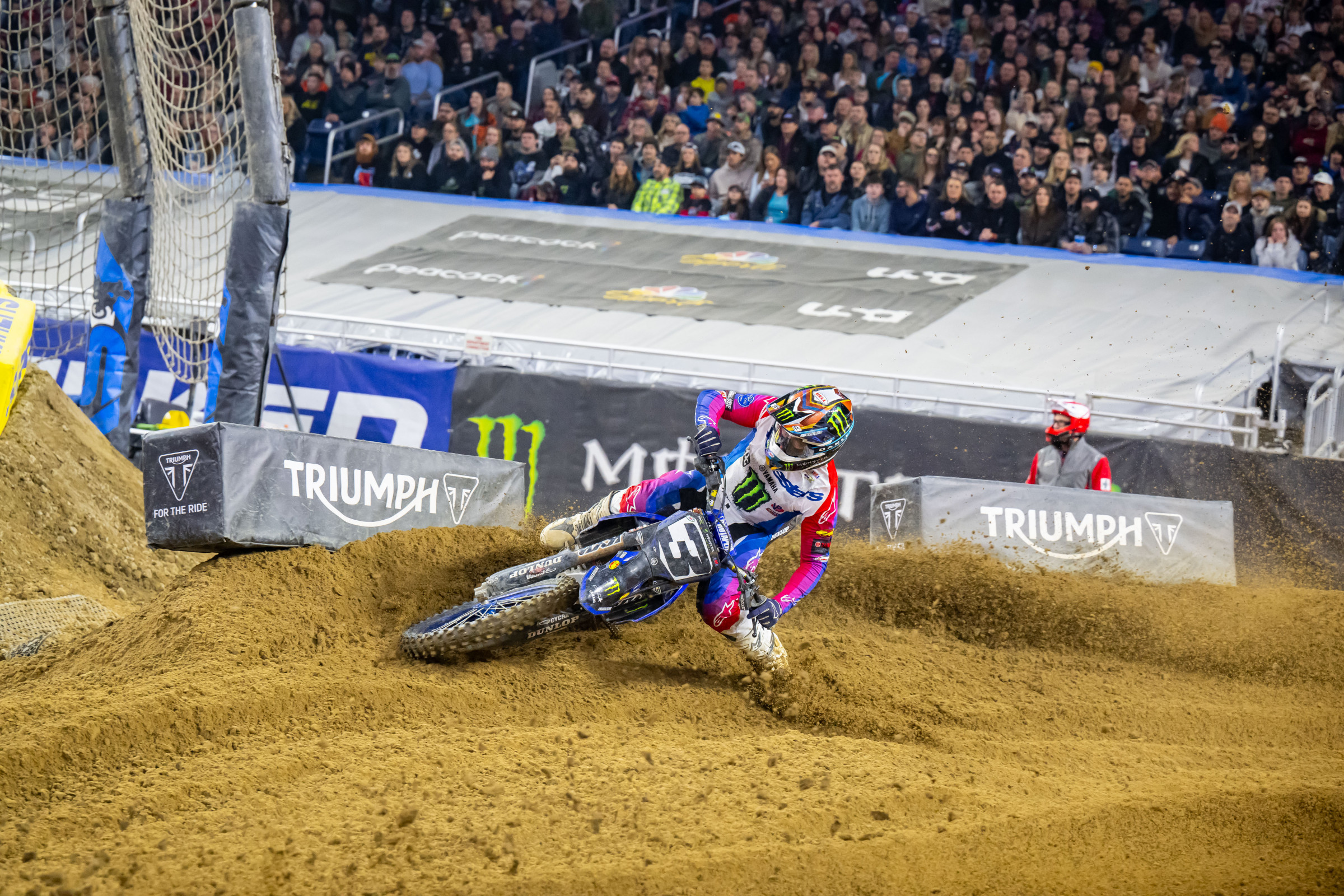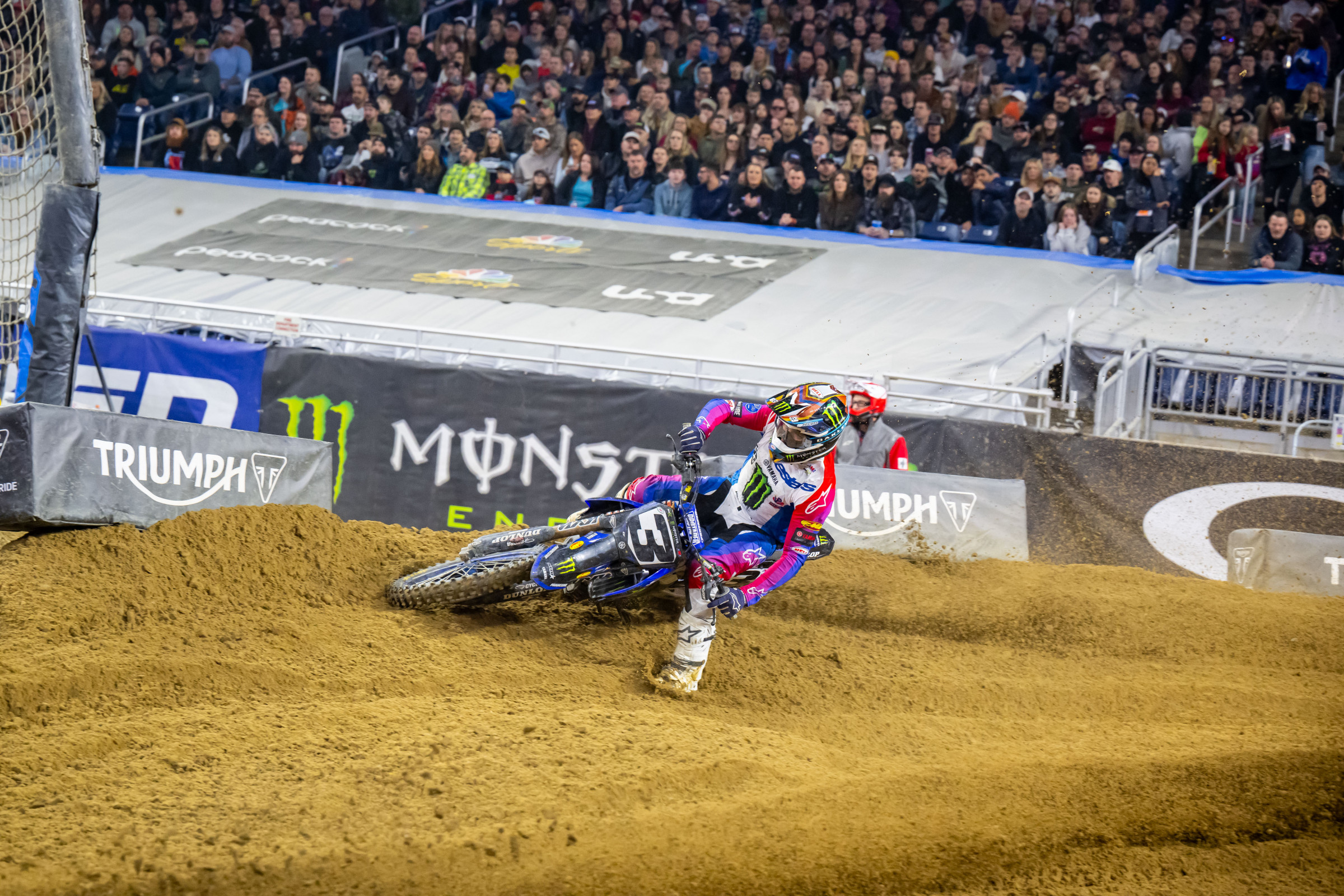 Coming off a victory in the final leg of the Triple Crown race last weekend in Anaheim, momentum seemed to be on Eli Tomac's side heading into Detroit. When he started third in the main event, it looked like a three-rider battle could be brewing with Tomac, Chase Sexton, and Jett Lawrence. Tomac stayed closed to the lead for a few laps, then it all fell apart and he drifted all the way back to 11th, ultimately finishing 10th after getting back around Justin Barcia late in the race. Tomac finished a lap down, which is obviously not what you expect from a two-time Monster Energy AMA Supercross 450SX Champion.