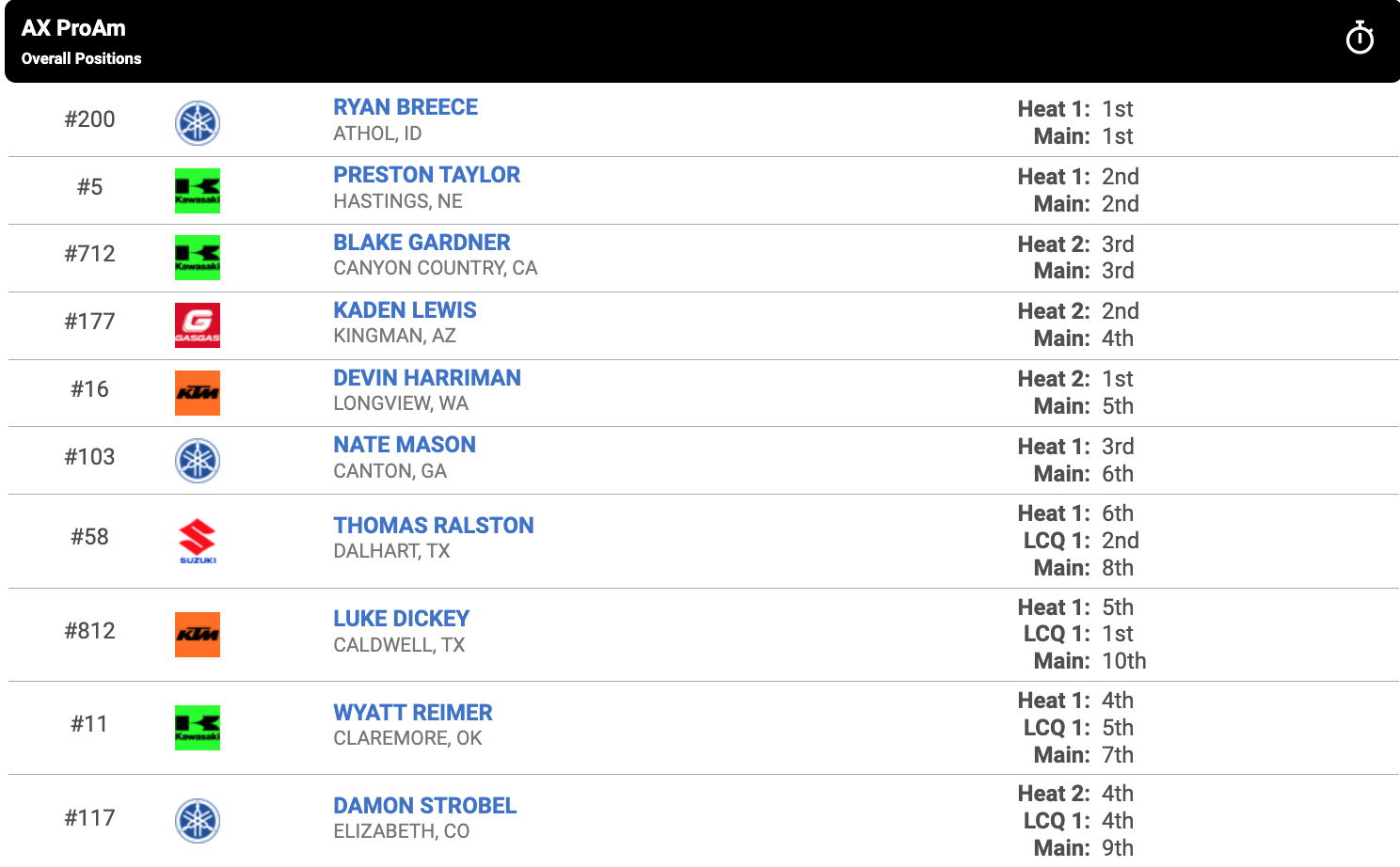 | 10 | Chance Hymas | +08.911 | 45.190 | Pocatello, ID | Honda CRF250R |