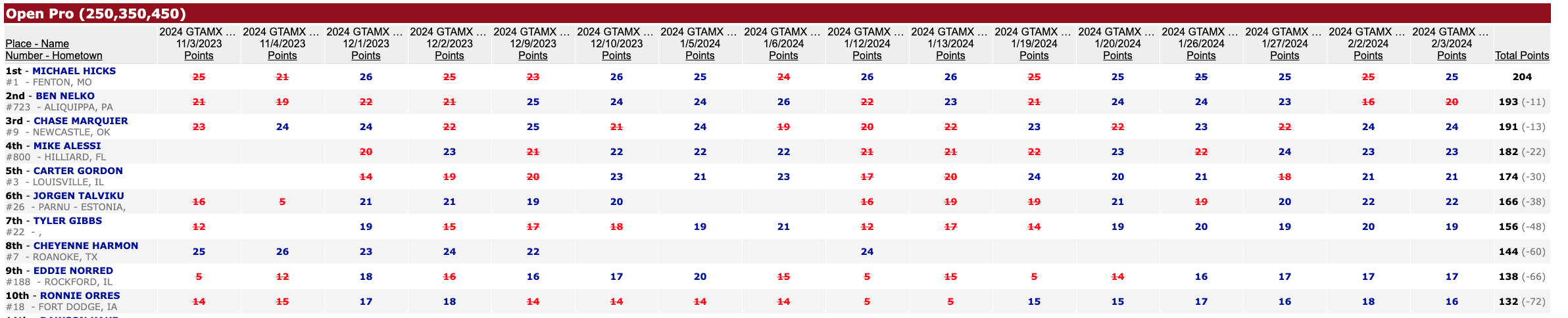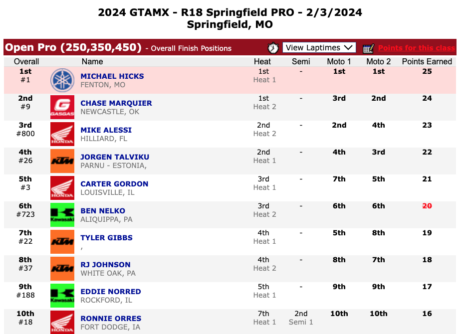February 3, 2024| Rider | Time | Interval | Best Lap | Hometown | Bike | |