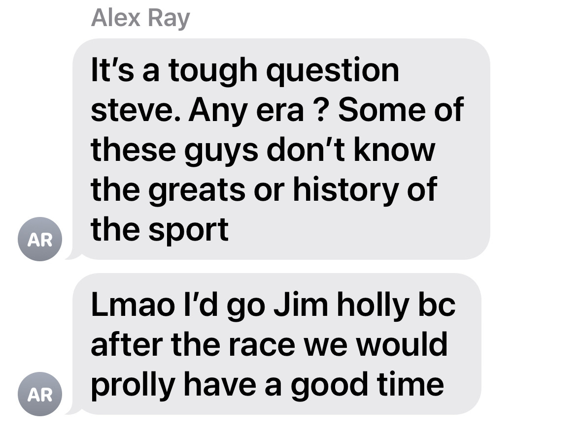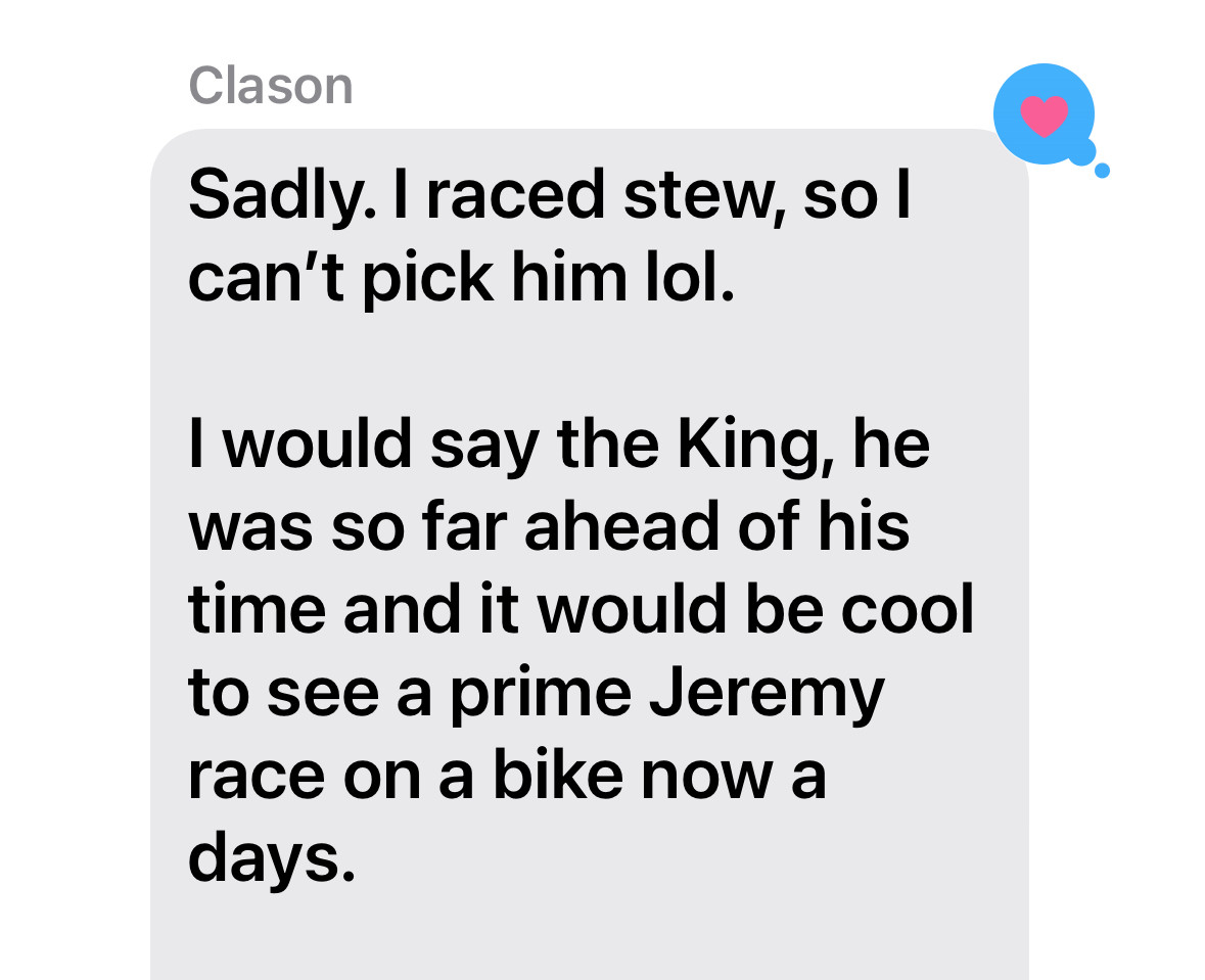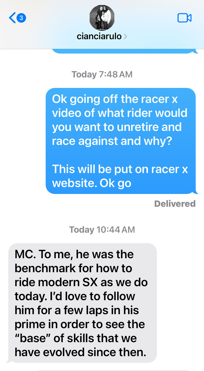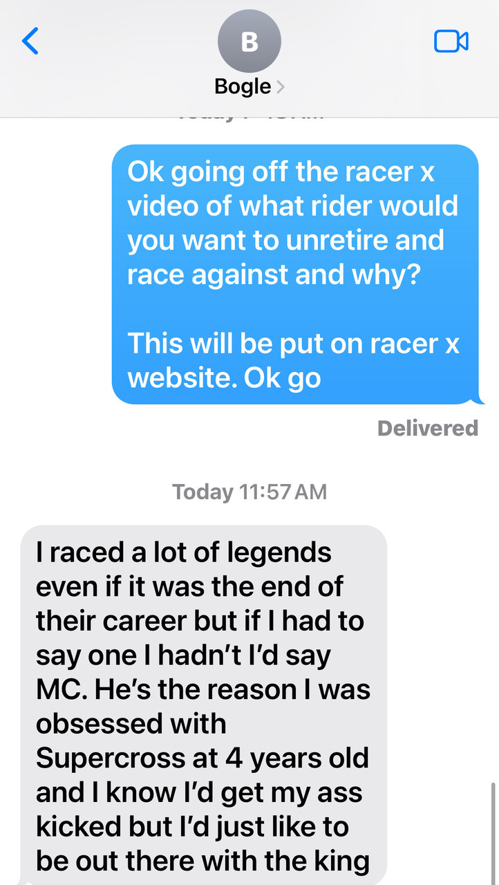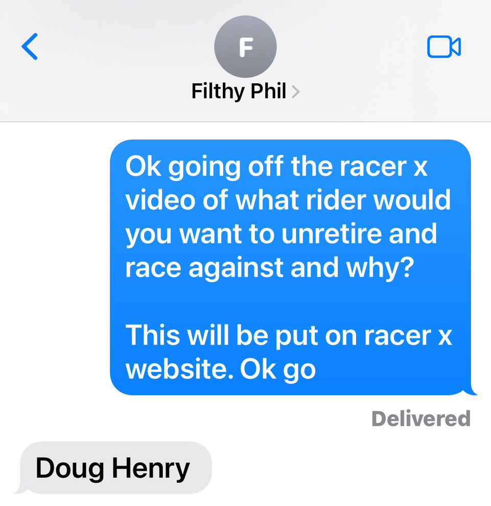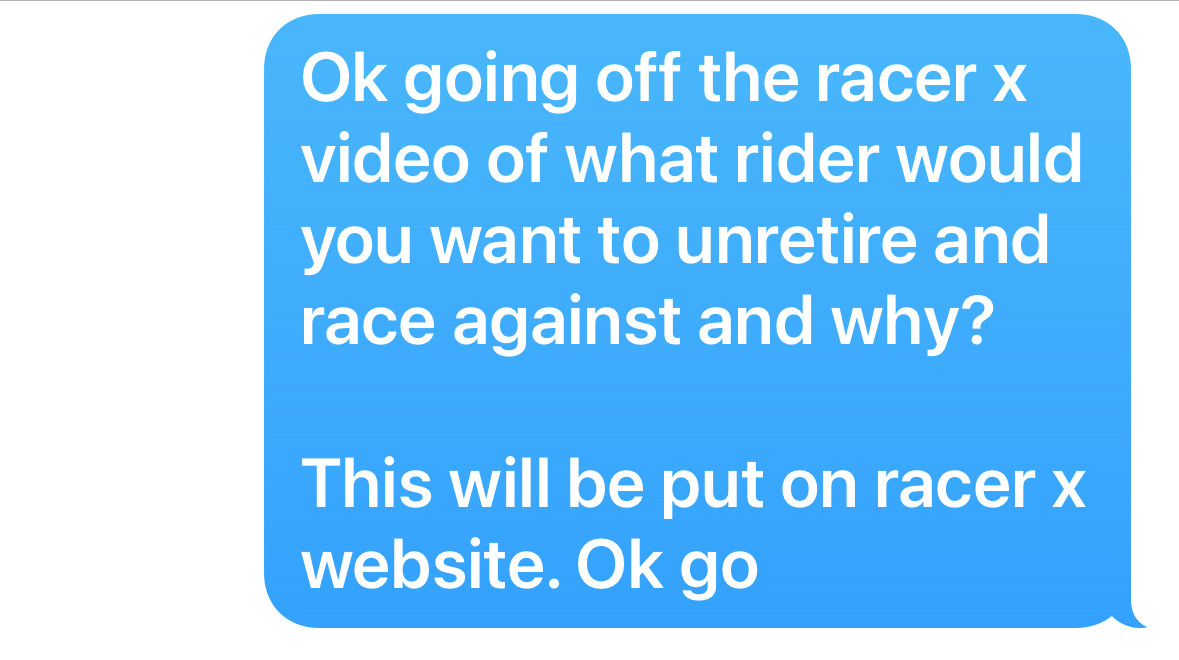 I’m in, like, 487 different group texts talking about the sport and mostly making fun of each other. When I saw that Racer X did a “Which rider would like to unretire and race against” Q & A on the site the other day, I thought what a great idea. I know it wasn’t Weege’s idea because he’s too busy with TV to care about us little guys.