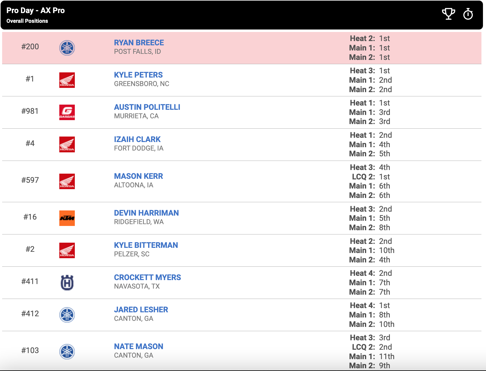 | 7 | Cooper Webb | +26.555 | 1:05.414 | Newport, NC | Yamaha YZ450F | |