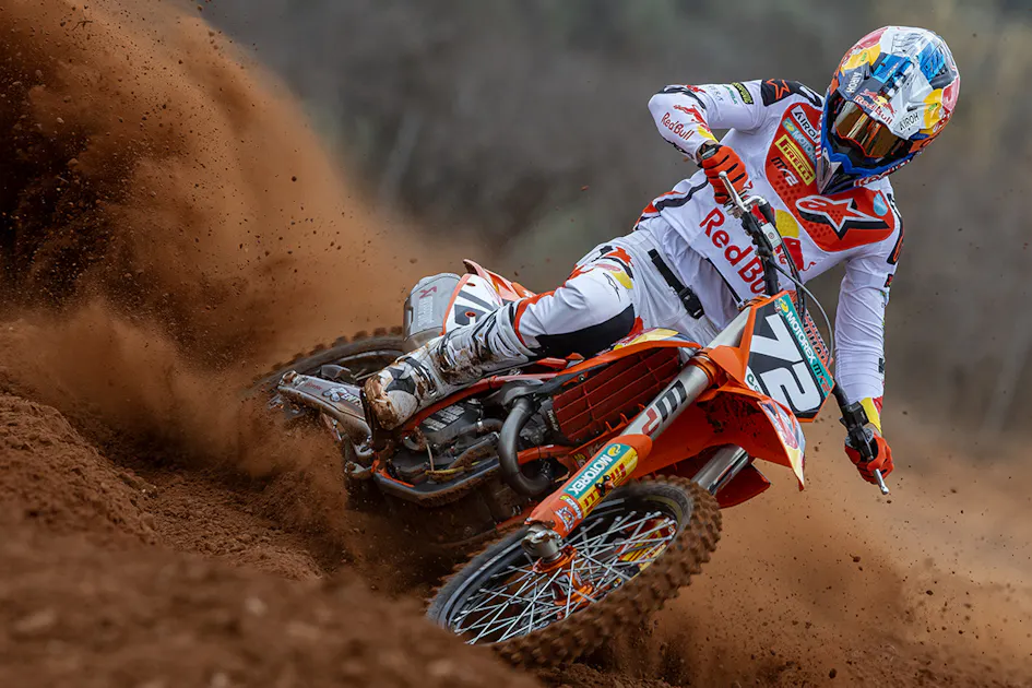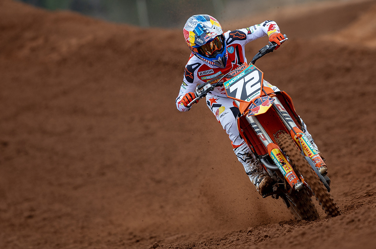 He just looked confident and in total control. Going 1-2, he was unfortunate not to go 1-1, but ran into a fallen lapped rider (lapped riders were a big problem in Mantova) and lost the second moto to his team-mate, Andrea Adamo, who just happens to also be the defending MX2 World Champion.