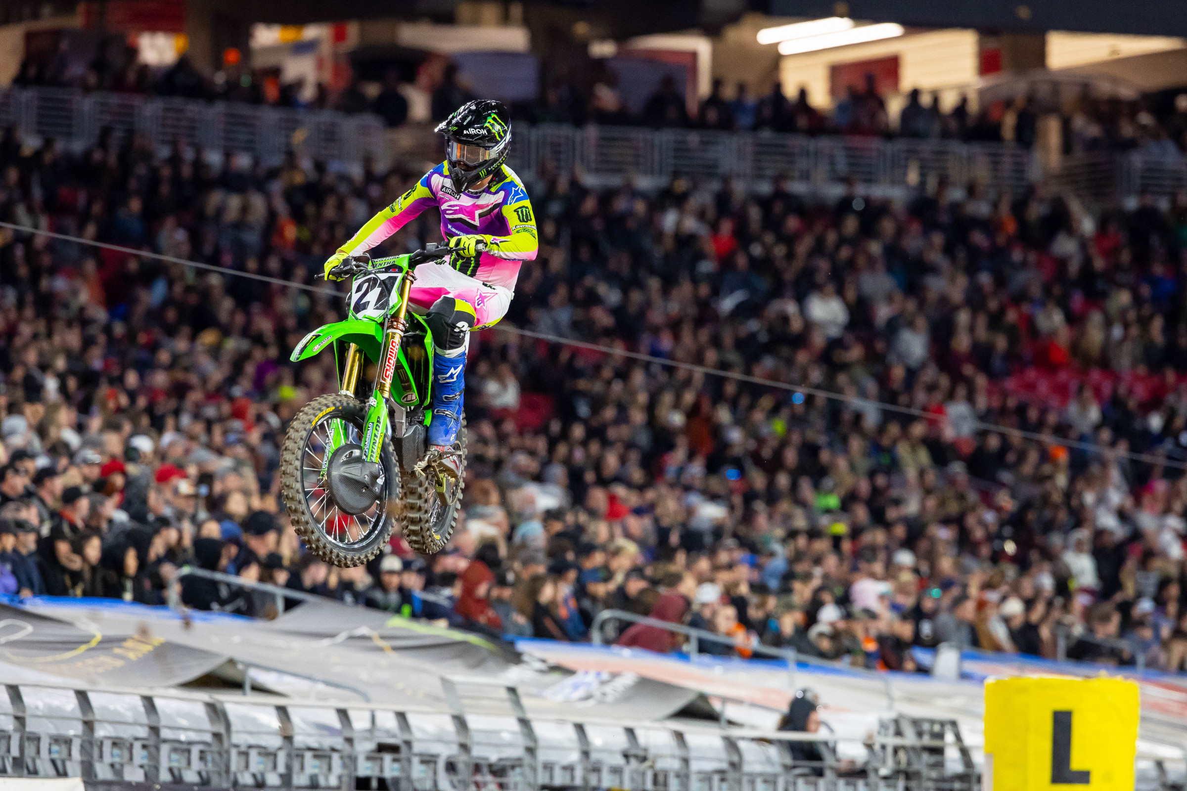The start for this year’s layout is eerily reminiscent of Detroit. The chute cuts across the end of the stadium and bends into a shallow 90 degree left. That same issue where riders run out of real estate in the first corner will be present. These issues flow from the inside to the outside as the natural momentum pushes riders wide and often onto the concrete. A good way to avoid this drama is by qualifying well and getting to the inside of the starting gates.