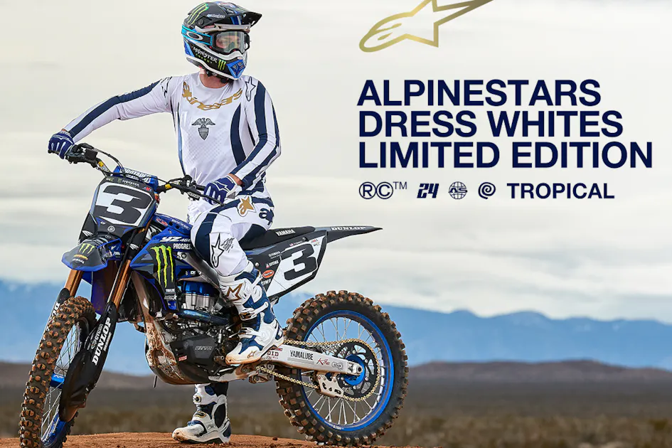 Inspired by the Tropical Navy Uniforms of years past, 2024 sees Alpinestars unveil its newest Limited Edition 'Dress Whites | Tropical' kit, paying homage to these heroes. Featuring a race-level Techstar Jersey and Pants with matching Tech 10 Boots, this Limited Edition release is a special addition to past military-inspired kits and will be worn by leading stars Eli Tomac, Chase Sexton, Jett Lawrence, Jason Anderson, Justin Cooper, and Hunter Lawrence when they touch down in Arlington on race day.