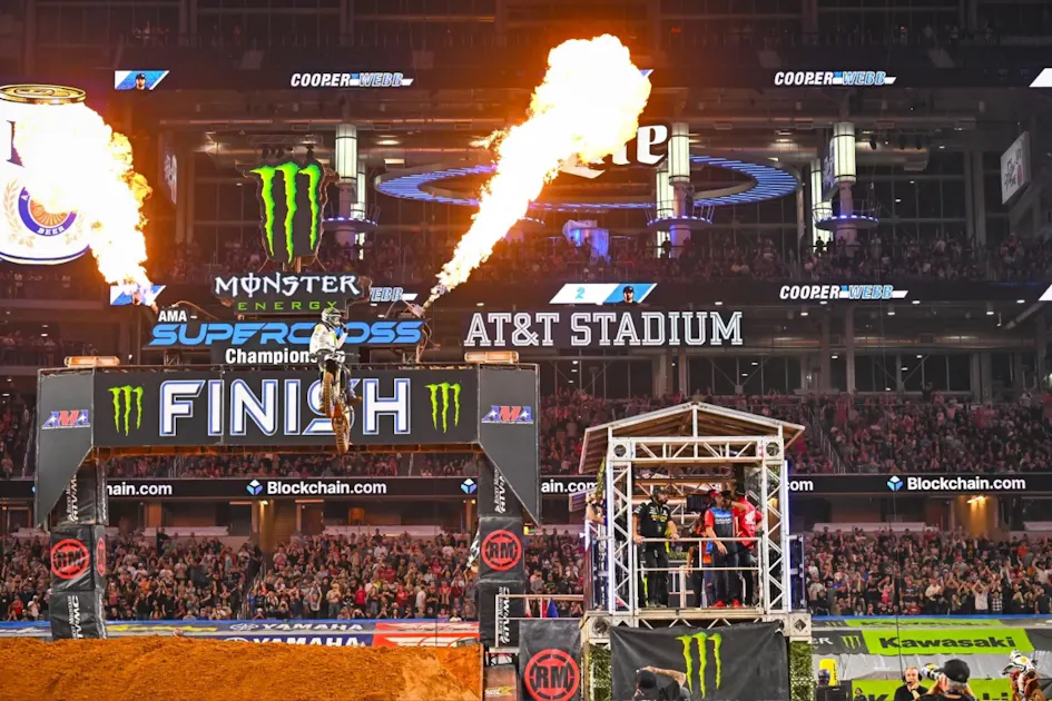 Just when you think this season’s Monster Energy AMA Supercross campaign is going to turn predictable, the momentum turns again, and that’s what happened at round 7 inside Arlington, Texas’ AT&T Stadium. In shocking fashion, the points leaders and would-be race winners in both classes went down in the same rhythm lane, and completely flipped the tides in both championships. In a season full of surprises, it was a night full of them, as well.